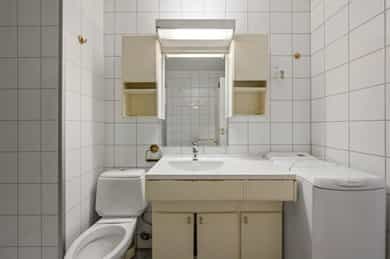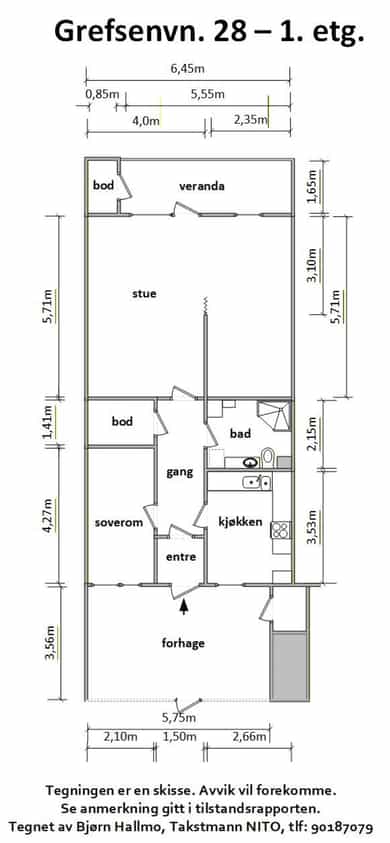 Det er i forbindelse med salget utarbeidet en tilstandsrapport fra bygningssakkyndig. Tilstandsrapporten er en teknisk gjennomgang av boligen med oppdagede avvik. Vedlagt salgsoppgaven følger tilstandsrapporten og selgers egenerklæring. Disse må leses nøye av interessenter før bud inngis. Opplysninger gitt i tilstandsrapporten anses å være kjent for kjøper, og det kan derfor ikke reklameres på forhold som fremkommer av tilstandsrapporten. Forhold som har fått TG2 og TG3 må gjennomgås spesielt nøye, da disse indikerer avvik fra normal slitasje og/eller høy alder, med mulig behov for utbedring. Bygningsdeler som har fått TGIU er ikke undersøkt av takstmann. Beskrivelsen av boligen som følger er hentet fra tilstandsrapporten: Leiligheten har i hovedsak byggeteknisk standard fra byggeperioden. Gavlvegger i betong. Ellers er vegger i bindingsverk. TG 2 Entredør: Entredør er fra byggeperioden. Vurdering av avvik: • Det er avvik: Det ble registrert at dørens lukkemekanisme ikke fungerte tilfredsstillende. For at døren skulle "holdes på plass" lukket, måtte dørlåsen benyttes. Konsekvens/tiltak • Tiltak: Takstmannen anmerker at det muligens vil avhjelpe på avviket å smøre mekanismen. Overflater vegger: Tapeter, malte flater. Vurdering av avvik: • Det er avvik: Det ble registrert en del skjolder og sår etter fester for bilder etc. Videre er det enkelte oppsprekk i skjøter. Konsekvens/tiltak • Tiltak: Overflatearbeider kan trenges. Innvendige dører Enkle finerte speildører. Dør inn til stuen med glassfelt. Vurdering av avvik: • Det er avvik: Det ble registrert at dør mellom entre og gangen gnisser mot karmen. Ellers mangler enkelte dører deler av håndtaket. Konsekvens/tiltak • Tiltak: Oppgraderinger må påregnes. Når det gjelder dør som tar mot karmen er det mulig at justeringer kan rette på forholdet. Kjøkken Innredningen er trolig fra byggeperioden. Enkel innredning med hvite glatte fronter. Kum, utslagsvask, samt side plate i ett i rustfritt stål. Ellers laminat benkeplate. Løse hvitevarer. Komfyrvakt er registrert (ikke funksjonstestet). Det var ikke krav til lekkasjevarsler da innredning ble montert. Vurdering av avvik: • Det er avvik: Slitasje grunnet alder og bruk må påregnes. Konsekvens/tiltak • Tiltak: Oppgraderinger, alternativt ny innredning må påregnes Ventilasjon (generelt) Leiligheten har tilførsel av luft via ventiler i yttervegg. Luft føres ut via ventiler i kjøkken og bad, felles mekanisk avtrekk. Vurdering av avvik: • Det er avvik: Badet har ikke tilfredsstillende tilførsel av luft. Konsekvens/tiltak • Tiltak: Det må etableres en tilfredsstillende spalte mellom dørbladet og dørterskel. Det anbefales at dørterskelen fornyes til en flat terskel. Alternativt sette inn en tilfredsstillende ventil mellom badet og gangen. Videre er ventilen i ytterveggen i soverommet innpakket med plast, noe som må rettes. TG 3 Bad Badet har byggeteknisk standard fra byggeperioden. Når badet, byggeteknisk, har standard fra før teknisk forskrift 1997, settes TG 3 automatisk. Da skal ikke takstmannen foreta videre vurdering av våtrommet, det være seg fall på gulv, eller tilstand for øvrig. Vurdering av avvik: • Våtrommet må oppgraderes for å tåle normal bruk etter dagens krav. Konsekvens/tiltak • Våtrommet har behov for omfattende oppgraderinger. For å sikre en løsning som oppfyller gjeldende krav, bør tettesjikt, sluk og røropplegg oppgraderes og dokumenteres. Kostnadsestimat: 200 000 - 500 000 Rørfordelerskapet er plassert i benkeskapet i kjøkkenet. Vurdering av avvik: Tilfredsstillende merking av vannrørene er ikke registrert. Tilfredsstillende stoppekraner er ikke montert. I henhold til et skriv fra styret til andelseiere i 2012 ble det gjennomførtoppgradering av vannrør samme år. Konsekvens/tiltak • Tiltak: For å stenge vannet er man avhengig av å ha en tilfredsstillende skrutrekker tilgjengelig, noe som ikke tilfredsstiller dagens krav. Dagens krav tilsier at både varmtvann og kaldtvann skal ha egne hendeler og være tilfredsstillende merket. Videre skal fordelerskapet ha kursoversikt for vannrørene (tilsvarende i et sikringsskap)Det er ikke mottatt noen informasjon, dokumentasjon, for utførte rørarbeider. Kostnadsestimat: Under 20 000