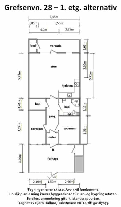 Eiendommen selges etter reglene i avhendingsloven. Generelle bestemmelser: Alle innvendige og utvendige arealangivelser, samt beskrivelser av bygningen er hentet fra vedlagte tilstandsrapport/boligsalgsrapport. Salgsoppgaven er basert på de opplysningene selger har gitt til megler, den bygningssakkyndiges tilstandsrapport, samt opplysninger innhentet fra kommunen, Kartverket og andre tilgjengelige kilder. Det er viktig at kjøper setter seg grundig inn i alle salgsdokumentene, herunder salgsoppgave, tilstandsrapport og selgers egenerklæring. Kjøper anses kjent med forhold som er tydelig beskrevet i salgsdokumentene, og slike forhold kan ikke påberopes som mangler. Dette gjelder uavhengig av om kjøper har lest dokumentene. Det kan være avvik fra dagens rombruk/rombenevnelser sammenlignet med det som er byggemeldt/godkjent. Alle interessenter oppfordres til å undersøke eiendommen nøye, gjerne sammen med fagkyndig før bud inngis. Kjøper som velger å kjøpe usett kan ikke gjøre gjeldende som mangel noe han burde blitt kjent med ved undersøkelsen. Dersom det er behov for avklaringer, anbefaler vi at interessenter rådfører seg med eiendomsmegler eller egne rådgivere før det legges inn bud. En bolig som har blitt brukt i en viss tid, har vanligvis blitt utsatt for slitasje og skader kan ha oppstått. Slik bruksslitasje må kjøper regne med, og det kan avdekkes enkelte forhold etter overtakelse som nødvendiggjør utbedringer. Normal slitasje og skader som nødvendiggjør utbedring, er innenfor hva kjøper må forvente og vil ikke utgjøre en mangel. Kjøper og selgers rettigheter og plikter reguleres av avtalen mellom partene, samt informasjonen som har vært tilgjengelig for kjøperen i forbindelse med handelen. Avtalen utfylles av avhendingsloven, og det gjelder ulike avtalevilkår avhengig av om kjøper er forbrukerkjøper eller ikke. Dette er nærmere beskrevet nedenfor. På grunn av ulike avtalevilkår kan selger vurdere bud fra en som ikke er forbruker, ulikt fra en forbrukers bud. Dersom kjøper ikke er forbruker, er selger sitt mulige mangelsansvar begrenset fordi eiendommen selges "som den er". Selger kan ikke ta «som den er» forbehold ovenfor en forbrukerkjøper. Selv et lavere bud fra en som ikke er forbruker kan foretrekkes fordi begrensningen i mulig mangelsansvar kan ha egenverdi for selger. Selger står fritt til å forkaste eller akseptere ethvert bud, og er for eksempel ikke forpliktet til å akseptere høyeste bud. Budgiver skal i budskjema avgi egenerklæring om budgiver er forbruker eller næringsdrivende/ person som hovedsakelig handler som ledd i næringsvirksomhet. Budgivere får informasjon dersom andre bud er inngitt av en som ikke er forbruker. Forbrukerkjøp - definisjon: Med forbrukerkjøp menes kjøp av eiendom når kjøperen er en fysisk person som ikke hovedsakelig handler som ledd i næringsvirksomhet. Forbruker – avtalevilkår: Eiendommen har en mangel dersom den ikke er i samsvar med kravene som følger av avtalen, eller det foreligger brudd på bestemmelsene i avhendingsloven §§ 3-2 til 3-8. Hvis eiendommen ikke er i samsvar med det kjøperen må kunne forvente ut ifra alder, type og synlig tilstand, kan det være grunnlag for mangelskrav. Det samme gjelder hvis det er holdt tilbake eller gitt uriktige opplysninger om eiendommen. Dette gjelder likevel bare dersom man kan gå ut ifra at det virket inn på avtalen at opplysningen ikke ble gitt eller at feil uriktige opplysninger ikke blir rettet i tide på en tydelig måte. Boligen kan ha en mangel etter avhendingsloven § 3-3 dersom det er avvik mellom opplyst og faktisk innvendig areal, forutsatt at avviket er på 2% eller mer og minimum 1 kvm. Ved beregning av et eventuelt prisavslag eller erstatning må kjøper selv dekke tap/kostnader opptil et beløp på kr 10 000 (egenandel). Ikke-forbruker (næringsdrivende) – definisjon: Hvis kjøper er en juridisk person, eller en fysisk person som hovedsakelig handler som ledd i næringsvirksomhet, vil kjøpet ikke anses som et forbrukerkjøp. Ikke-forbruker – avtalevilkår: Eiendommen har en mangel dersom den ikke er i samsvar med kravene som følger av avtalen. Eiendommen selges «som den er», og selgers ansvar utover det konkret avtalte er da begrenset etter avhendingsloven § 3-9, første ledd andre setning. Avhendingsloven § 3-3 andre ledd fravikes, og hvorvidt boligens arealsvikt utgjør en mangel vurderes etter avhendingsloven § 3-8. Informasjon om kjøpers undersøkelsesplikt, herunder oppfordringen om å undersøke eiendommen nøye, gjelder også for kjøpere som ikke anses som forbrukere.
