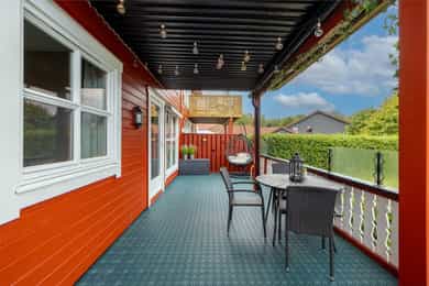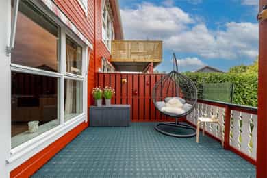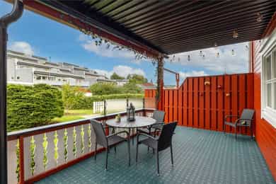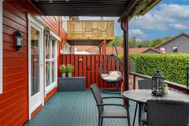 Rett utenfor stuedøren disponerer leiligheten en delvis overbygget terrasse på hele 23 kvm. Denne fungerer som en fantastisk utestue som forlenger sommersesongen. I direkte tilknytning til terrassen følger en egen, usjenert hageflekk med plen, perfekt for lek og avslapning.