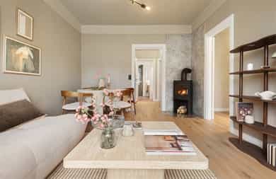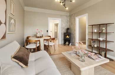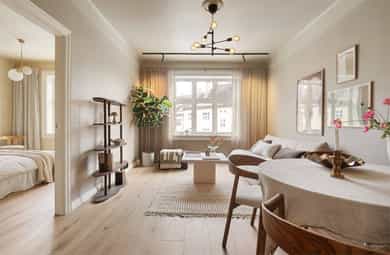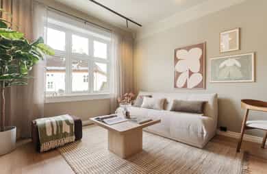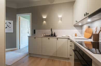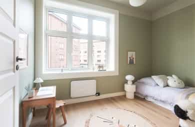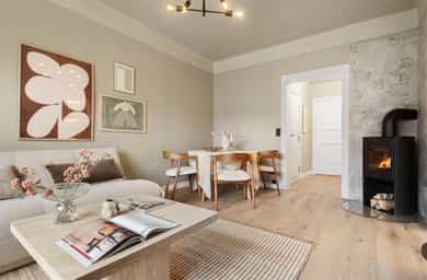 Meget pen og attraktiv 3-roms selveier som er nylig oppusset med bla. nytt kjøkken og nye overflater. Leiligheten har god planløsning og gir et svært godt totalinntrykk. Populær beliggenhet, stille og rolig på attraktive Torshov, mellom Torshovparken og Torshovdalen i klassisk Torshovgård, " Strykejernet". Flott bakgård opparbeidet med bla. sosiale soner og lekeapparater. - Nytt HTH kjøkken med nye integrerte hvitevarer i 2025 - Oppgradert el-anlegg 2026 med nye jordfeilautomater, ny jordskinne og ny kursfortegnelse. - Installert trådløst Plejd-system for styring av belysning i alle rom, inkludert programmering via app. - Montering av ny peisovn 2026 - Avretting av gulv med legging av Opus klikk-vinyl på alle rom 2025 - Maling av av alle overflater i 2025 - Lave felleskostnader