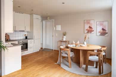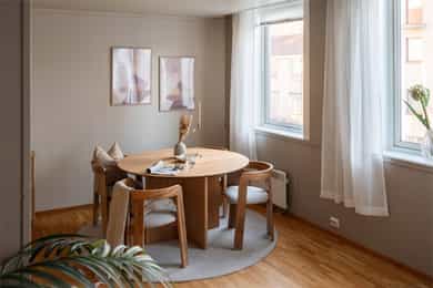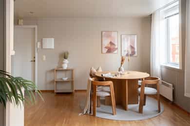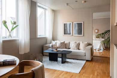 Smakfull 2-roms selveier på 47 m². Sentralt, skjermet og idyllisk boområde. Heis, bod og parkering. Lave bokostnader.