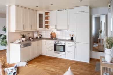 Følger med boligen: Integrert oppvaskmaskin og kjøleskap. Vaskemaskin kan etter avtale medfølge uten garanti.