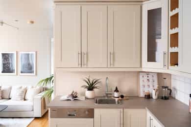 2026: Malt kjøkkenfronter, ny benkeplate, ny kum, nytt blandebatteri, malt veggoverflater, noe elektrooppgradering