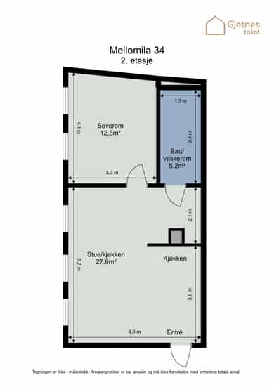 2. etasje: Entré, bad/vaskerom, stue/kjøkken, soverom. Ekstern bod.