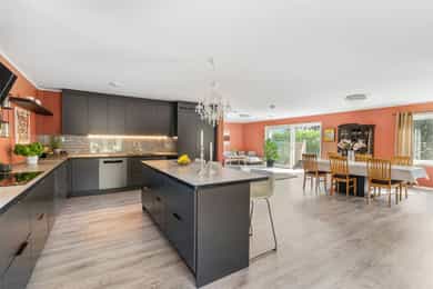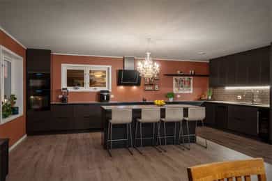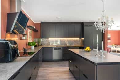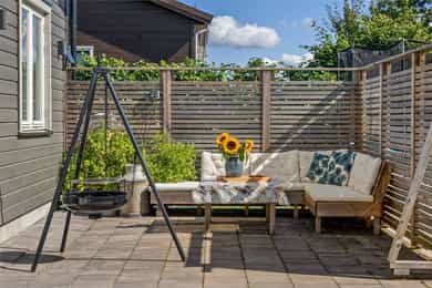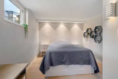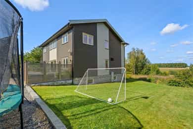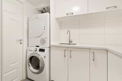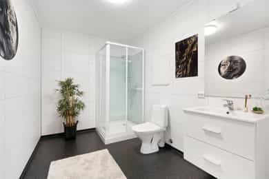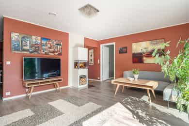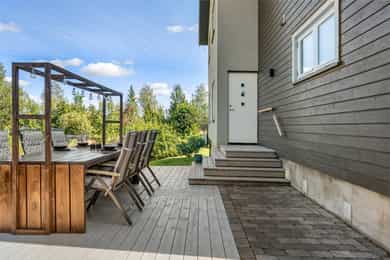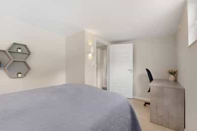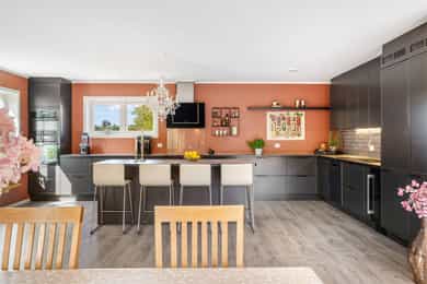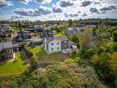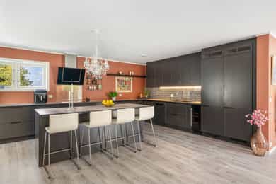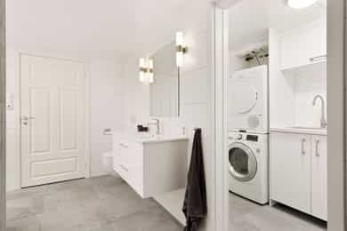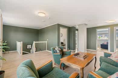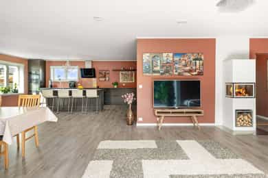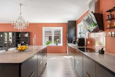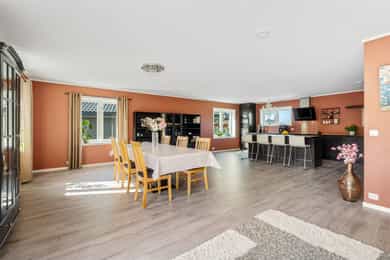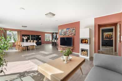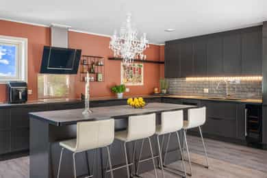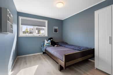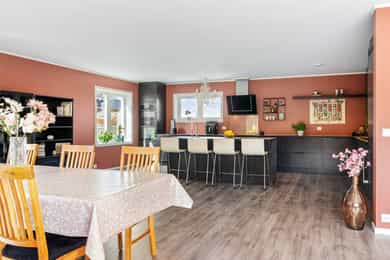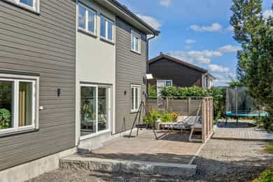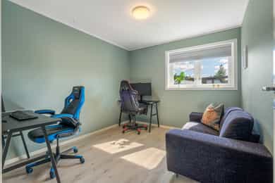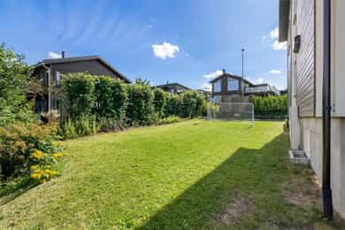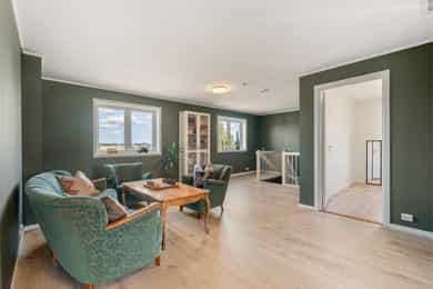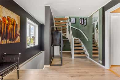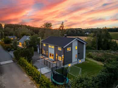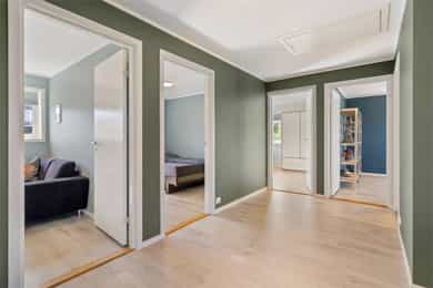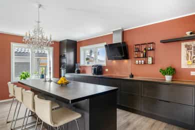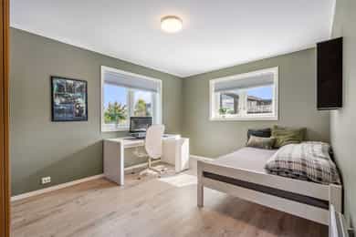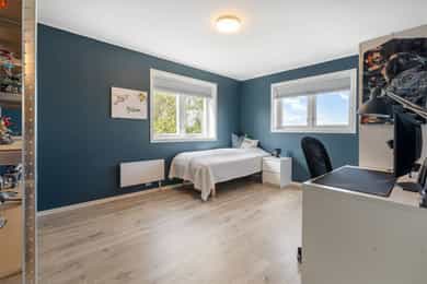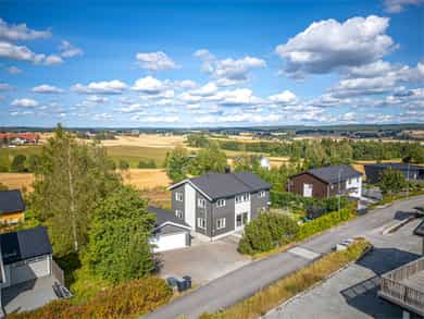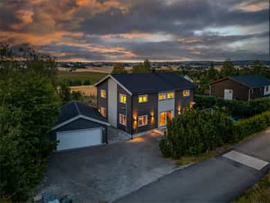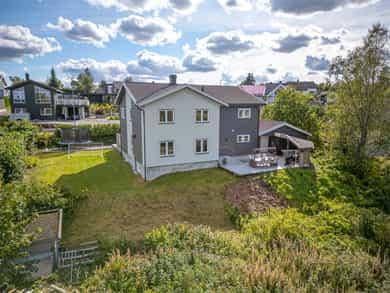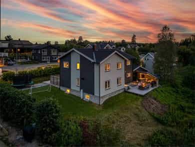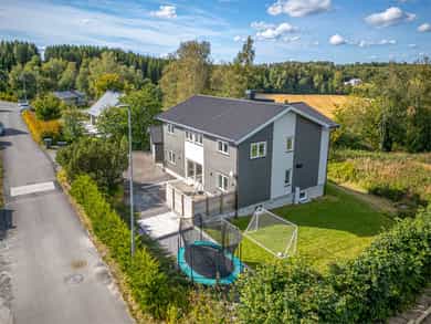- 1. etasje - Entré: Du ankommer boligen via et hyggelig, pent opparbeidet inngangsparti opparbeidet med platting og brostein. I boligen møtes du av en romslig gang som gir et umiddelbart godt og riktig førsteinntrykk. Gangen er stor, og det er god plass til oppbevaring av yttertøy og sko i stort garderobeskap eller knagger/plass til skohylle. Fra gangen er det trappeløp som tar det enkelt til 2. etasje og kjelleren. Videre fra gangen er det tilknytning til omkledningsrom som sikrer godt med ekstra lagringsplass. På omkledningsrommet er det sikringsskap og ventrilasjonsaggregat. Åpen kjøkken- og stueløsning: Stilsikkert, pent og innholdsrikt kjøkken med spiseplass og kjøkkenøy. Kjøkkenet er levert av kvalitetsleverandøren Strai. Moderne innredning fra 2019 med mørke, 1-speils profilerte fronter, glassplater og tapet på vegg over kjøkkenbenken og benkeplate i laminat. Nedfelt, dobbel vaskekum og ettgreps blandebatteri i rustfritt stål med uttrekkbart munnstykke. Det er integrert platetopp med induksjonstopp, to stekeovner, to kjøleskap, oppvaskmaskin og vinskap. Det er lekkasjestopper og komfyrvakt. Mekanisk avtrekksvifte over stekesonen. På kjøkkenet er det godt med lagringsplass i benkeskap, overskap og skuffer. Det er spiseplass ved kjøkkenøya og god plass til stort spisebord. Boligen har en storslått stue som er svært romslig og kan naturlig deles i flere soner. Stuen er i dag innredet med spisestue i den ene delen og dagligstue i den andre delen. I stuedelen er det god plass til sofagruppe med tilhørende sofabord og tv-benk. Planløsningen i rommet er svært god og innredes enkelt etter eget ønske. Store vindusflater (fra 2019) med lysinnslipp fra flere himmelretninger gir en luftig og svært god romfølelse. Overflatene ble pusset opp i 2019 med en-stavs laminat og veggene er malt i en stilig fargetone. Videre har stuen en moderne peis levert av Norpeis (2017). Peisen gir behagelig, vedvarende varme og bidrar til hyggelig stemning på kalde høst- og vinterkvelder. Husets tre etasjer har til sammen mye boltreplass for en barnefamilie, spesielt hovedetasjen der stuen og kjøkkenet er åpent forbundet i en gjennomgående sosial sone. Det er utgang til hagen og terrassen via bred skyvedør. Dette bidrar til at uteplassen oppleves som er forlengelse av stuen hele sommerhalvåret. Sørvendt steinbelagt uteområde på ca. 33 kvm. og platting på ca. 9 kvm. Hovedsoverom: På hovedsoverommet er det god plass til dobbeltseng og nattbord på hver side. Rommet har store vinduer som sikrer godt med lys og luft. Det er plass til skap/kommode. Bad: Delikat, tidløst bad oppgradert i 2014. Rommet har flislagte overflater med 30x60 cm fliser på gulv og vegger og 5x5 cm mosaikkfliser på gulv i nedsenket dusjsone. Det er behagelig gulvvarme og downlights i himling. Innredning og garnityr består av veggmontert toalett og dusjhjørne med glassdører og ettgreps dusjbatteri i rustfritt stål med to dusjhoder (håndholdt og regnfall). Baderomsinnredning med 90cm bred servantbenk med flislagte hyller, mørk steinbenkeplate og overmontert keramisk servant med ettgreps blandebatteri i rustfritt stål fra Hans Grohe. - 2. etasje - Seks soverom: Boligen har en svært barnevennlig planløsning med hele seks soverom, stue og bad på samme plan. Alle rommene har god tilknytning til hverandre via åpen stue og gang. Rommene passer godt som barnerom, gjesterom eller hjemmekontor, og har alle god plass til både seng, skrivepult og skap. Rommene er malt i senere tid og er holdt i tidsriktige, moderne fargevalg. Rommene innredes enkelt etter ønske, behov og livssituasjon. Stue: Herlig, ekstra stue som har mange innredningsalternativer. Her er det kun kreativiteten som setter begrensninger. Rommet passer utmerket som tv-stue, hobbyrom, bibliotek eller kontor. Stuen er i dag innredet med sofagruppe. Hele 2. etasje ble bygd på i 2019, noe som sikrer stilrene, velholdte overflater, pent gulv og moderne fargevalg. Bad: Flott, romslig bad fra 2019. Badet har overflater med belegg på gulv med varmekabler og våtromsplater på vegger med imitasjon av fliser. Badet er utstyrt med gulvstående toalett, dusjkabinett med glass-skyvedører og ettgreps dusjbatteri i rustfritt stå og 60cm bred baderomsinnredning med hvite, høyglansfronter, keramisk servant og ettgreps blandebatteri i rustfritt stål. Rommet er for øvrig utstyrt med rørfordelingsskap og mekanisk avtrekk. - Kjeller - Vi gjør oppmerksom på at kjelleren er byggemeldt som bodareal. Stuene i kjelleren har ikke vindu og tilfredsstiller ikke krav til varig opphold. Kjellerstue og tv-stue: I kjelleren er det to hyggelige stuer med både kjellerstue og tv-stue. I denne delen er sjarmen fra byggeår er ivaretatt. Stuene i underetasjen er av generøs størrelse som i utgangspunktet gir ekstra boltreplass og kan være barnas egen avdeling for TV-spill, lek og moro i god distanse til oppholdsrommene i etasjen over. Rommene innredes enkelt etter ønske og livssituasjon, og har god plass til eksempelvis innredning som sofagruppe, bibliotek, treningsrom eller lagring. Det er original vedovn i den ene stuen. Bad/vaskerom: Lekkert og delikat bad pusset opp i 2014. Badet har stilrene overflater med 60x60 cm fliser og 5x5 cm mosaikkfliser i dusjsonen. Rommet inneholder veggmontert toalett, dusjnisje med glassdør og ettgreps dusjbatteri i rustfritt stål fra Hans Grohe med to dusjhoder (håndholdt og regnfall), badekar og bred baderomsinnredning med skuffer, servant og ettgreps blandebatteri i rustfritt stål fra AXOR Hans Grohe. Vegghengt speil og belysning. Mekanisk avtrekk og gulvvarme. Tilknyttet badet er både et teknisk rom og et separat vaskerom som er smart innredet til sitt formål med blant annet arbeidsbenker og stor skapmengde. Vaskerommet har opplegg for vaskemaskin, kum og masse skapplass. Soverom: Lunt og innbydende soverom i kjelleren. Rommet har god plass til dobbeltseng, nattbord og skivepult. Soverommet har behagelig gulvvarme.