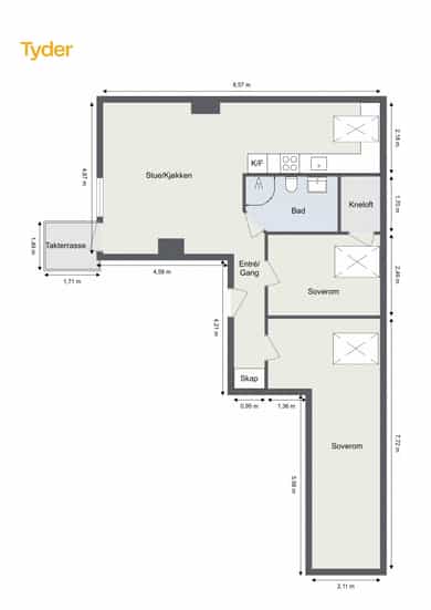BRA-i: 47 kvm. Entré/gang, stue/kjøkken, bad og to soverom.