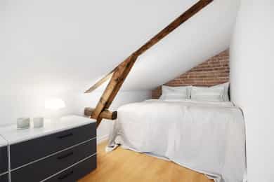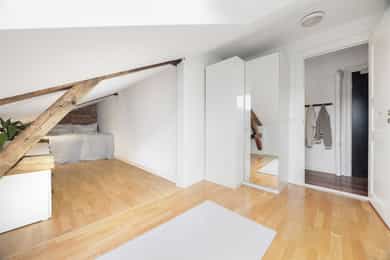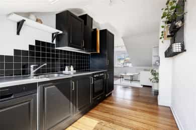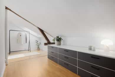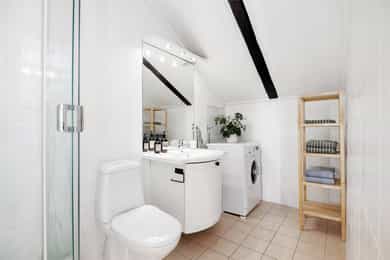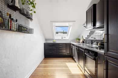 5.etasje, 47 kvm BRA-I: Entré/gang, stue/kjøkken, bad og to soverom. Entré og gang: Lys og funksjonell inngang med plassbygget garderobeskap som gir god oppbevaringsplass. Inngangen har parkettgulv og malt overflate. Stue: Lys og innbydende stue med skråtak og gode lysforhold fra både takvinduer og vindu mot takterrassen. Rommet har god plass til sofagruppe og spisebord, og oppleves luftig med den åpne himlingshøyden. Fra stuen er det utgang til en privat takterrasse som gir ekstra romfølelse og uteliv i høyden. Takterrasse: Privat takterrasse på ca. 2,5 m² med flott utsyn. Her er det plass til utemøblement og et lite spisebord, hvor man kan nyte morgenkaffen. Her han man iht. selger sol fra soloppgang til ca. kl. 15, før den titter tilbake ca. kl. 17 ytterst på balkongen. Kjøkken: Kjøkkenet ligger i åpen forbindelse med stuen, men har sin egen naturlige sone. Innredningen har profilerte fronter, laminert benkeplate med nedfelt kum og fliser over benk. Alt av hvitevarer er integrert, inkludert stekeovn, keramisk topp, oppvaskmaskin og kjøl/frys. Ventilator er montert over koketopp, og det er godt med skap- og benkeplass til hverdagsbruk. En funksjonell og sosial kjøkkenløsning. Bad: Delikat flislagt bad med dusjkabinett, servant, toalett og opplegg for vaskemaskin. Badet har varmekabler i gulvet. Soverom 1: Hovedsoverom med skråtak og eksponert teglstein på én vegg, som gir rommet karakter. Her er det plass til dobbeltseng og oppbevaring. Soverom 2: Perfekt som barnerom, gjesterom eller hjemmekontor. Malt glassfiberstrie på vegger og god takhøyde på det høyeste punktet. Kjellerbod: Ekstern bod i kjeller med gulvareal på 10 kvm gir ekstra lagringsplass.
