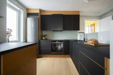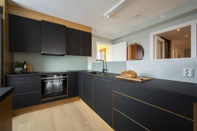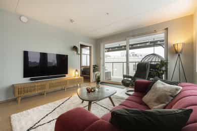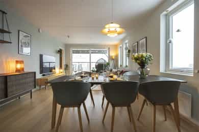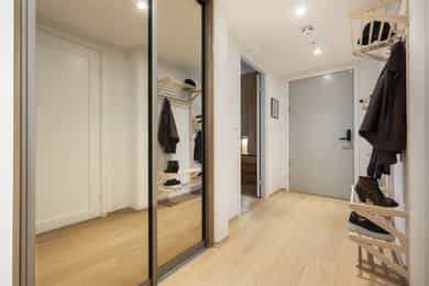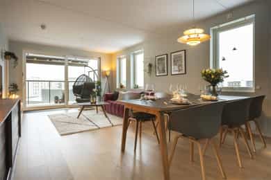Det er adkomst via felles inngangsparti hvor det er trappeoppgang og heisadkomst. Oppgangen har callinganlegg med videofunksjon. ENTRÉ Velkommen inn til en flott leilighet med romslig gang og god plass til oppbevaring i praktisk, plass bygd garderobe. Elektronisk lås på ytterdør gjør det enkelt å komme inn med samme brikke som til blokka, og gir mulighet for app-styring. Interiøret i hele leiligheten preges av lyse, moderne flater. Et perfekt utgangspunkt til å innrede med egne møbler og gjenstander for å skape sitt personlige preg. Her vil du trives! STUE MED UTGANG TIL BALKONG Stuen er lys og innbydende med store vindusflater som gir et godt lysinnslipp og fin utsikt mot nærområdet. Planløsningen er åpen og praktisk, med plass til både sofagruppe, TV-møbel og spiseplass. Gulvet er belagt med en-stavs parkett og har en fin takhøyde på 2,49 m. Et perfekt utgangspunkt for å innrede med egne møbler og gjenstander for å skape ditt drømmehjem. Leiligheten er utstyrt med zip-screens for solskjerming på vest- og sydvendte vinduer, inkludert balkongdør, noe som bidrar til et behagelig inneklima. Videre er boligen oppgradert med xComfort smarthus-løsning som gir trådløs styring av både belysning og zip-screens. Trådløse brytere kan plasseres der man ønsker, og det er mulighet for app-styring ved anskaffelse av gateway. Fra stuen er det direkte utgang til en sydvestvendt balkong på ca. 13 m². I vår- og sommerhalvåret blir balkongen en naturlig forlengelse av stuen, perfekt til samvær og fine stunder med familie og venner eller en rolig morgenkaffe. Her har du ditt eget, private uteområde, og du kan enkelt innrede med utemøbler, beplantning og gass- eller elektrisk grill. Balkongen er utstyrt med fjernstyrt markise med både fjernkontroll og app-gateway, som gjør det enkelt å regulere solskjerming etter behov. ÅPEN KJØKKENLØSNING MOT STUEN Kjøkkenet fremstår moderne med glatte fronter og laminat benkeplate med nedfelt vaskekum. En stor kjøkkenøy med barløsning gir ekstra arbeidsflate og fungerer som et naturlig samlingspunkt, og er i tillegg utstyrt med innebygd vinskap (Norcool Cave 40) samt stilrent vitrineskap. Det er integrert oppvaskmaskin, platetopp og stekeovn, samt kjøkkenventilator plassert over kokeplassen. Innredningen er levert av Sigdal, og kjøkkenet er i tillegg utstyrt med vannstoppsystem og komfyrvakt som bidrar til økt sikkerhet i hverdagen. Den åpne løsningen mot stuen skaper en luftig og innbydende romfølelse, og gjør det enkelt å lage mat samtidig som man kan være sosial og holde kontakt med familie og gjester. HOVEDSOVEROM MED BADEROM OG WALK-IN-CLOSET (Adkomst fra entréen) Hovedsoverommet, med adkomst direkte fra entréen, fremstår romslig og innbydende. Her er det god plass til dobbeltseng, nattbord og øvrig møblering, samtidig som en plassbygd garderobe og smarte oppbevaringsløsninger bidrar til å holde rommet ryddig. I tillegg er soverommet tilknyttet en innvendig bod som benyttes til walk-in-closet og annen oppbevaring. Vinduer gir naturlig lys og bidrar til en behagelig atmosfære, og rommet er utstyrt med innvendige motoriserte rullegardiner fra IKEA, som gir ekstra komfort. Tilknyttet hovedsoverommet finner du et pent flislagt baderom med elektrisk gulvvarme for ekstra komfort. Badet har himling med lakkerte stålplater og innfelte downlights, og er innredet med vegghengt klosett, servant nedfelt i innredning og dusjhjørne med svingbare glassdører. Balansert ventilasjon sikrer godt inneklima. SOVEROM 2 og 3 Soverommene er romslige og fleksible, med god plass til seng, skap og øvrige møbler. De egner seg like godt som barnerom, gjesterom eller hjemmekontor - alt etter dine behov. Begge rom har vinduer som slipper inn rikelig med naturlig lys og skaper en behagelig atmosfære. Soverommet som i dag brukes som barnerom, er utstyrt med innvendige motoriserte rullegardiner fra IKEA, mens soverommet som i dag benyttes som hjemmekontor har både zip-screen og innvendige persienner. Dette gir en enkel og komfortabel lysregulering av rommene. Rommene har også gode muligheter for praktisk oppbevaring, slik at de kan holdes ryddige og oversiktlige. BADEROM Pent flislagt baderom med elektrisk gulvvarme med termostat som gir ekstra komfort på kalde dager. Himlingen har lakkerte stålplater med innfelte downlights. Badet er innredet med vegghengt klosett, servant nedfelt i innredning og dusjhjørne med svingbare glassdører, samt opplegg for vaskemaskin. Balansert ventilasjon sørger for godt inneklima. OPPBEVARING Leiligheten disponerer en bod i kjeller på ca. 5 m², merket nr. 19 i kjellerrom U1-15. ØVRIG INFORMASJON Entrédør: Lyd- og brannklassifisert entrédør. Vinduer: Vinduer med 3-lags press glass, prod 2019. Balkongdør: Skyvebalkongdør med 3-lags glass, prod 2019. Overflater etc.: Himlinger med malte betongelementer og malte plater, innfelte downlights i entréen. Vegger med malte plater. Gulv med en-stavs parkett. Takhøyden: Takhøyden i stuen ble målt til 2,49 m og 2,22 m i entré. Innerdører: Innerdører med omramming. Innerdør med glassfelt fra entré. Ventilasjon: Balansert ventilasjon. Elektrisk anlegg: Automatsikringer. Oppvarming: Elektrisk oppvarming og elektrisk gulvvarme på bad. VERDT Å VITE - Oppgradert dusj- og servantarmaturer fra opprinnelig konfigurasjon - Kjøkkenet utvidet med 80cm fra opprinnelig konfigurasjon for å gi ekstra oppbevaring - Endeleilighet med veldig godt utsyn og begrenset innsyn - Kjøkkeninnredning med stillegående lukking og press-for-å-åpne (Blum Tip-on Blumotion) - Røroshetta avtrekk med integrert komfyrvakt - Siemens Stekeovn med pyrolyse-funksjon - Stillegående Siemens oppvaskmaskin med app-styring - Siemens kombi kjøl/frys-skap - Bred (70cm) Siemens platetopp