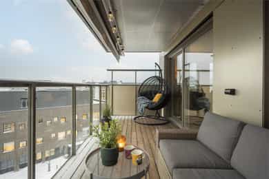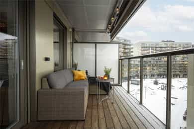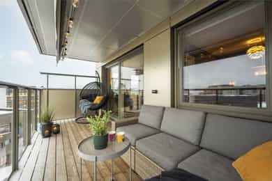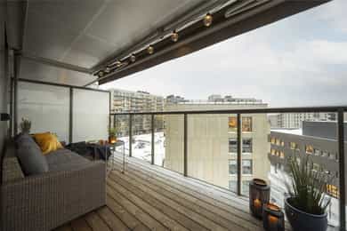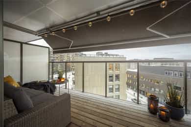 - Det er montert markise (styrt via fjernkontroll og app) på balkongen og motoriserte screens for solskjerming på alle sør- og vestvendte vinduer.