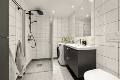 Badet ble oppgradert i 2025 med ny dusjarmatur, baderomsinnredning, servant, blandebatteri, høyskap og dolokk.