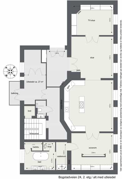 Leiligheten ligger i 2. etasje og inneholder entré/gang, TV-stue, stue, 3 soverom, kjøkken/spiseplass, bad/vaskerom, bad og badstue. Balkong på 3 m². Leiligheten disponerer 3 kjellerboder på hhv. 9,09, 8,77 og 8,56 m². Det medfølger loftsboder med skråtak og arealet er ikke målbart i sin helhet. Det gjøres særskilt oppmerksom på at bod som er medtatt som BRA-e og i totalt BRA ligger på fellesareal, men disponeres av denne leiligheten.