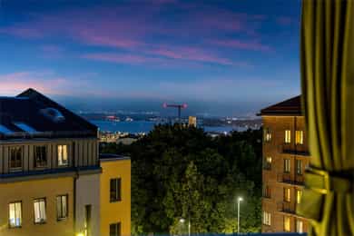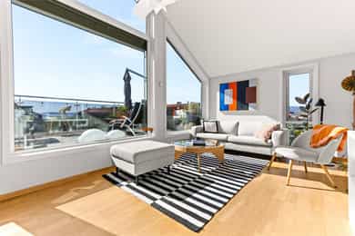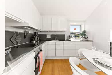 Innvendig overflater: - Gulv: Fliser på bad. Parkett ellers. - Vegger: Fliser på bad. Malte overflater ellers. - Tak/Himling: Malte overflater i alle rom. Entré: Du ankommer leilighetsplanet med enkel heisadkomst. Vel inne blir du møtt av en innbydende og lys entré som gir et godt førsteinntrykk av leiligheten. Det er plass til å henge fra seg yttertøy i en praktisk innvendig bod, som gjør det enkelt å holde det rent og ryddig i hverdagen. Stue: Med store vindusflater og nydelig utsikt er dette hjertet av leiligheten. Takhøyden er på hele 4,9 meter, og med vinduer fra gulv til tak slippes det inn rikelig med naturlig lys, noe som gir rommet en flott atmosfære. Stuen har en fin planløsning med plass til sofagruppe, TV-møbler og øvrig møblement. Veggene er hvitmalte, og gulvet er dekket med parkett med behagelig gulvvarme. Herfra er det utgang til en fantastisk terrasse på ca. 27 m². Terrassen er romslig, med plass til ulike sittegrupper, planter, grill og parasoll. Med gode solforhold og flott utsikt kan man virkelig finne roen i en ellers hektisk hverdag. Hems: Fra stuen er det tilgang til en svært praktisk hems med gode innredningsmuligheter. Hemsen er på 10m², med et gulvareal på 16m², og flere soner, slik at man enkelt kan innrede med seng, oppbevaringsmøbler, skrivepult eller hva man måtte ønske. Kjøkken: Separat kjøkken med en funksjonell og praktisk utforming, rikelig skapplass og god benkeplass til matlaging. Det er også god plass til spisebord i rommet, og med vinduer fra flere sider kan man nyte den fantastiske utsikten. Stilren innredning med hvite fronter og laminert benkeplate. Kjøkkenet er utstyrt med alt man trenger i hverdagen, som platetopp, stekeovn, oppvaskmaskin og kombinert kjøle-/fryseskap. Over stekesonen er det ventilator med mekanisk avtrekk til kanal. Bad: Romslig bad med opplegg for vaskemaskin. Badet er fra byggeåret 2011 og har flislagte overflater, behagelig gulvvarme og downlights i taket. Videre er badet innredet med nedfelt servant med underskap, speil, toalett, håndkletørker og dusjhjørne med skyvbare glassdører. Rommet er tilkoblet mekanisk avtrekksvifte. Soverom: Flott soverom med plass til dobbeltseng og tilhørende møbler. Plassen er godt utnyttet med stor skyvedørsgarderobe, samt flere hyller og skap for ekstra lagringsplass.