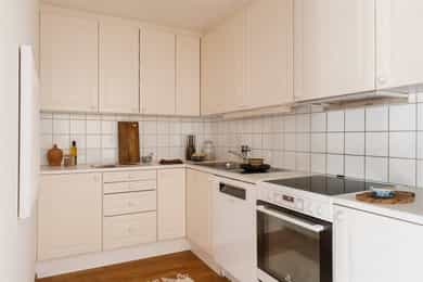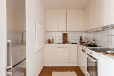 Integrerte hvitevarer medfølger og vaskemaskin medfølger.