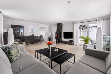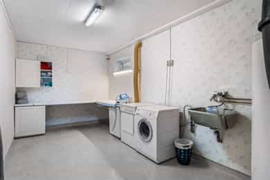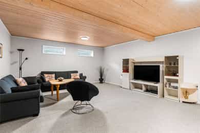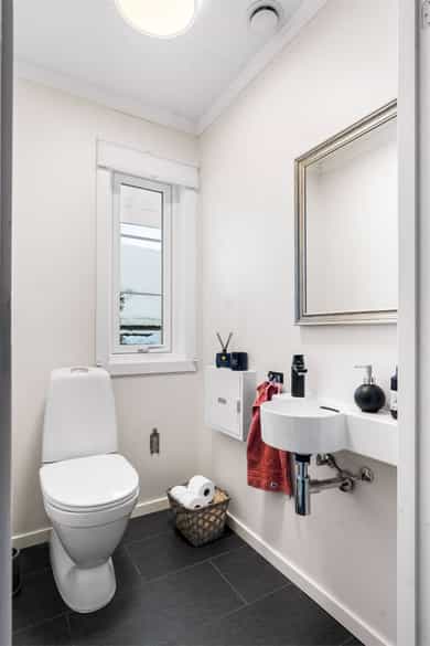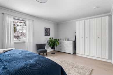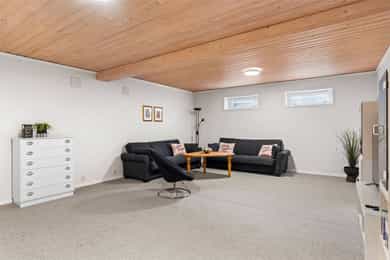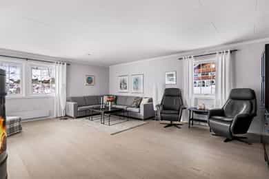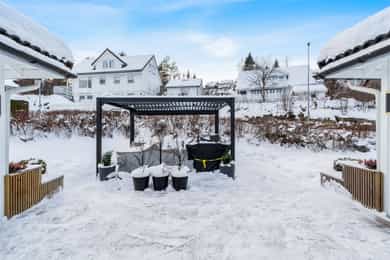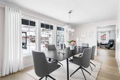 1. ETASJE Entré: Velkommen! Boligen har et svært innbydende inngangsparti, med en adkomstterrasse på ca. 15 m². Her ute er det pass til stoler og bord. Vel inne i entréen er det praktiske fliser på gulvet, samt malte vegg- og himlingsflater. I gangen er det god plass til å henge fra seg yttertøy i stor garderobe. Entréen ble oppgradert i 2022, med nye varmekabler i gulv samt nye fliser. I tillegg ble det satt inn ny ytterdør. Stue: Stuen er av svært generøs størrelse, med mange innredningsmuligheter. I stuen er det plass til sofaseksjon, tv-møbel og lenestoler. I rommet er det tilkoblet en peisovn, som sikrer ekstra varme i vinterhalvåret. Det ble montert en praktisk zip-screen utvendig på det doble vinduet i stuen, samt på terrassedøren med vindu i 2023. Det er utgang til en herlig treterrasse på ca. 45 m². Her ute er det god plass til flere sittegrupper, samt grill. Terrassen ble utvidet i 2022 og det ble montert pergola - det gjøres oppmerksom på at denne utvidelsen m.v. ikke er blitt omsøkt hos kommunen (se punktet Ferdigattest for mer informasjon). Fra terrassen er det videre utgang til den opparbeidede hagen. I 2022 ble det også etablert innbygde blomsterkasser. I 2023 ble det montert en ny markise på hageterrassen. Spisestuen ligger innenfor stuen, og har rikelig med plass til stort spisebord - her er det plass til hele storfamilien! Kjøkken: Boligen har et separat kjøkken, med en moderne Kvik-innredning fra 2020. Skapene har malte slette fronter, samt en keramisk benkeplate med oppvaskkum. Videre er det fliser mellom overskap og benkeplate, samt godt med belysning. Rommet har integrerte hvitevarer som stekeovn, induksjonstopp, mikrobølgeovn, vinskap og oppvaskmaskin. Over koketoppen er det tilkoblet en ventilator. I tillegg er det egen nisje til dobbelt kjøleskap (kjøleskapet medfølger ikke). Det er plass til spisebord med stoler ved kjøkkenvinduet. Bad: Etasjen har et romslig baderom, med flislagte overflater. Badet er i fra 2020, det fremgår av tilstandsrapporten at det foreligger dokumentasjon på arbeidet. Rommet er utstyrt med baderomsinnredning, dobbel servant, servantskap, servant, veggmontert wc og dusjhjørne med innfellbare dører og badekar. Badets gulvflater har fått TG3 av takstmann grunnet utilstrekkelig fall mot sluk, samt TG2 grunnet enkelte "bom" i fliser. Toalettrom: Toalettrom med servant og wc. Toalettrommet er oppusset i 2024. To soverom: Boligen har to soverom. Hovedsoverommet har plass til dobbeltseng med tilhørende nattbord. Videre er det plass til klesoppbevaring i garderobeløsning. Soverom nr. 2 fungerer ypperlig som barnerom, gjesterom eller kontor - her er mulighetene mange. Rommet har plass til seng, nattbord, garderobeløsning og evt. skrivebord. Rommet er delvis delt. UNDERETASJE Gang: Fra trappen kommer man ned i en romslig gang. Herfra er det inngang til bad, vaskerom, disp. rom og bodarealer. Vaskerom: Vaskerommet er utstyrt med med skapinnredning, utslagskum og opplegg for vaskemaskin. Det ble registrert fuktforskjeller i gulv rundt varmtvannsbereder og sluk, og rommet er totalt sett av eldre standard. Takstmann gir vaskerommet TG3. Bad: Baderommet i kjelleren har flislagte gulv- og veggflater, samt takess i himling. Rommet har servant, servantskap, speilskap, wc og dusjhjørne med innfellbare dører. Baderommet får TG2 av takstmann grunnet alder. Disp. rom innredet som kjellerstue: Det ene rommet er blitt innredet som kjellerstue. Rommet er omtalt som "disp" i siste godkjente byggetegninger, og tilfredsstiller ikke dagens krav til rom for varig opphold. Disp. rom innredet som soverom: Det ene rommet er blitt innredet som soverom. Rommet er omtalt som "vask" i siste godkjente byggetegninger, og tilfredsstiller ikke dagens krav til rom for varig opphold. Øvrig bodareal: Resterende areal i etasjen egner seg godt til oppbevaring. INNVENDIGE OVERFLATER Gulv: Parkett, laminat og fliser. Vegger: Malte flater, malt strie. panel og tapet. Himling: Takess og panel. For full oversikt over tilstandsgrader, se punktet Byggemåte eller se vedlagt tilstandsrapport.