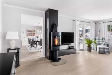 Stue/spisestue - revet skiferpeis, montert ny peisovn, fliselagt pipestokk - lagt ny parkett på gulv i både stue, spisestue og kjøkken