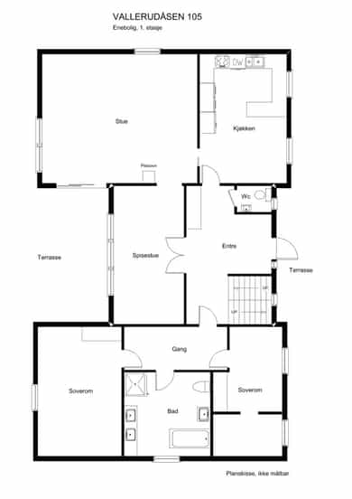 BRA-i: 149 kvm. Entré, wc, gang, 2 soverom, bad, stue, spisestue og kjøkken.