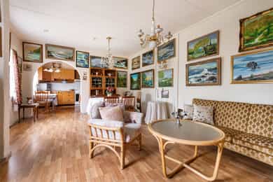 Heisann skriver jeg alltid her. Bli med på en guidet tur skriver jeg også her, men denne gangen skal jeg ikke vise deg veien gjennom alle de forskjellige rommene. Det er rett og slett for mange av de og de har så forskjellige bruksområder, så jeg tar heller og guider deg gjennom de store trekkene her inne. Det meste i huset er av eldre dato og dermed er det mye som er utdatert her, så jeg føler ikke at jeg trenger til å se at her trengs det oppussing i alle rom vi skal gjennom. La oss starte med det gode gamle skolebygget som er det første du kommer til. Det ser ut som et helt vanlig hus fra slutten av 18-tallet. Litt sveitserstil. Her inne finner du to leiligheter LEILIGHET 1 ETG. Består av vindfang og entre, eldre bad, 1 eller to soverom, kjøkken og en eller to stuer. Velg selv om du skal ha flere stuer og færre soverom eller flere soverom og færre stuer. En lav kjeller under denne etasjen LEILIGHET 2 ETG. Nesten lik som første etg med stor stue du enkelt kan stjele litt plass til enda et soverom. Så har du et bad, et kjøkken, soverom og et kontor som har vært benyttet som et ekstra soverom. I tillegg har du en krok som har vært benyttet som delvis vaskerom. Du har rett og slett litt plass til overs her. HOVEDLEILIGHET I HOVEDHUSET 1 etg betsår av en leilighet med en gedigen hybel. Jeg prøver og dra deg gjennom denne labyrinten av en bolig. Får håpe du digger det like mye som jeg gjør. Når du kommer inn så kommer du til en entre som antageligvis har vært et lobbyområde, nå er det en kjempestue med kun vindusflater på begge sider. For en velkomst når du kommer hjem Så går du rett inn i den meget store stua som du bør fylle med store møbler, og gjerne mange av de. For her har du plass til alt og litt til. Videre innover kommer til et soverom på høyre side og et soverom på venstre side. Her inne finner du også toalettrom. Videre finner du et kott og et meget stort bad, før du går inn på et todelt kjøkken- Hvor du har et vaskerom i ytterkant av kjøkkenet. Her er man egentlig veldig fornøyde med det man har sett av kvadratmeter og plass. Men på et elelr annet tidspunkt fant dagens eier ut at det hadde vært smart med en hybel i huset siden de hadde så mye folk "fra andre siden av Dammen" på besøk så da etablerte de det som de kaller hybelen, men som egentlig er en fullverdig leilighet med egen inngang også her. HYBELDELEN I HOVEDHUSET Vi går inn fra gangen i hovedhuset og kommer inn i en ny gang som også har et lite bad. Det leder oss inn i en liten stuedel som igjen drar oss videre innover til storstua og videre innover til kjøkkenet. Fra kjøkkenet fortsetter vi til en ny gang som også har egen utgang til hagen, et nytt vaskerom og et nytt soverom. Som også har en morsom bue som leder ut til en ute/innerom bygget litt som en borg (du må se for å forstå) som igjen leder til en terrasse ute. UNDERETASJE Nå starter humoren og bli bra her. For når man skal ned kan du trykke på heisknappen. Da skjer forøvrig ingenting, for det er bare en knapp, men ingen heis her, så du må pent ta trappen. Når du kommer ned til kjelleren så møter du faktisk heisen, eller du møter heisdørene som har blitt benyttet som dør inn til denne etasjen. Jeg syntes dette er kraftig bra humor i hverdagen. Liker du det ikke så sett inn vanlig dør, eller dropp døra i sin helhet. Denne etasjen er litt ribbet slik at det er vel egentlig bare vegger og gulv her nede. Men vi kan jo se konturene av hva som har vært. for her er det mye greier og veldig store muligheter. Legger jeg takstrapporten til grunn så kjørere jeg på og ramser opp rom for rom Bad Kjøkken med utgang til hagen Innebod Bod med vindu, antatt brukt som soverom Bad Kjøkken Stue Entre med utgang til hage Soverom (meget stort og med utgang til hagen Gang soverom Som dere ser utifra plantegningen så har vi virkelig gjort så godt som mulig for å få korrekt gjengivelsene av rommene og hva de har vært benyttet som. Men om du ønsker deg en skokk av soverom til så tviler jeg på at du trenger så mange stuer eller kjøkkenrom. Det er sjeldent jeg som megler blir såååå begeistret for en bolig, men her ser jeg for meg mange muligheter og veldig mye gøy GARASJE / LÅVE Fra 2001 og eiendommens nyeste bestanddel Når garasjen din blir på 92 kvm vil jeg snart begynne å kalle det for noe annet. Men har har du ihvertfall mye plass og mange muligheter. VEDBOD Det står en liten bod i hagen. Kjekt for å ha ting og tang i, men du har sååå mange andre plasser her at jeg hadde revet den for å heller ha en finere hage. Det valget lar jeg bli ditt. Den står nå her og fyller en funksjon. KONKLUSJON Dette er noe så spesielt at det er nesten vrient å beskrive hva du egentlig kommer til å se. For det oppleves som en trivelig og noe utdatert familiebolig med 2-3 utleiedeler og en gedigen hage. Dette er for deg som kanskje er litt kunstnerisk, litt bohemsk, eller bare for deg som virkelig vil ha en bolig der du kan leke deg med uttallige rom. Eller kjøp eiendommen sammen med noen venner og lag deres eget paradis her oppe. For det begynner å bli billige kvadratmeter og det er så mange av de LES TAKSTRAPPORTEN OG BEREGN GOD TID PÅ VISNINGEN. DETTE ER IKKE EN VANLIG BOLIG, OG VI MANGLER MYE KUNNSKAP OM DENNE BOLIGMASSEN. Etter beste evne har vi forsøkt og tolke eiendommen sammen med en takstmann. Regn med avvik på rommenes bruk og hva de opprinnelig er avsatt til. Sjeldent har jeg oppfordret sterkere til å ta med fagfolk som kan se på eiendommen sammen med deg og hva du tenker og bruke den til.