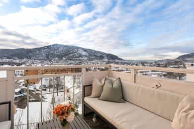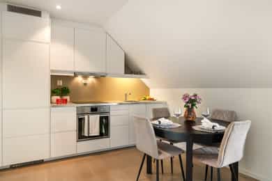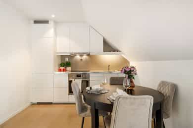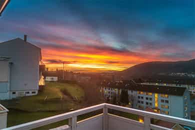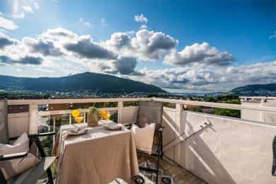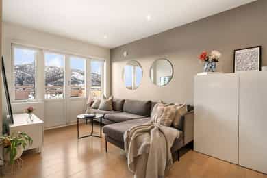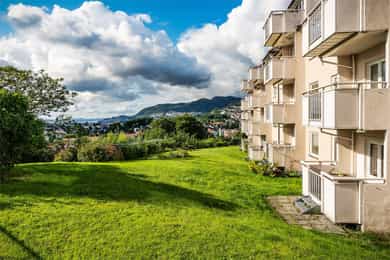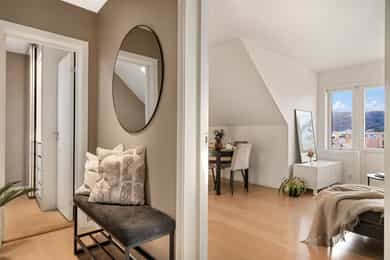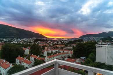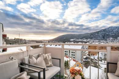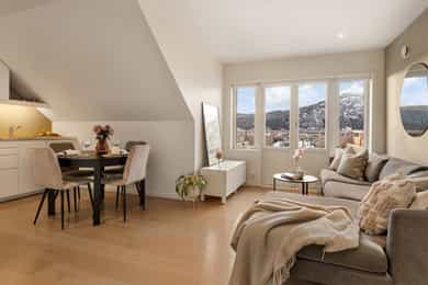 Lys og attraktiv toppleilighet med balkong m/fantastisk utsikt mot byfjorden. Mye inkl. i felleskost. Kort vei til "alt"