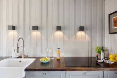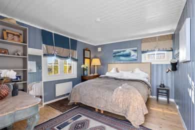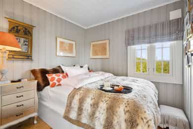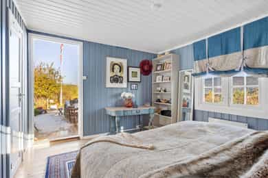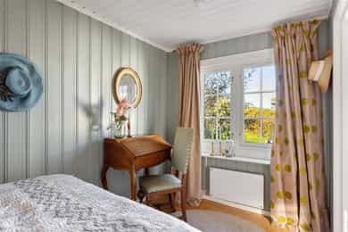 - Gardiner, spisebord, seng i det store rommet i annekset.