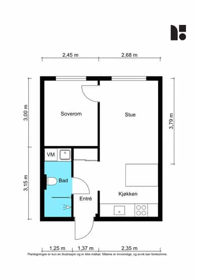 Oppmålingen er fysisk utført med en håndholdt avstandsmåler som har nøyaktighet på +/- 1 mm. Rommene betegnes slik de fremstår og blir benyttet som under befaringen, selv om de i enkelte tilfeller kan avvike fra godkjente byggetegninger og gjeldende byggeregler. Angivelsen av rom for varig opphold i rapporten innebærer ikke nødvendigvis at rommet er, eller kan bli, godkjent for varig opphold i samsvar med dagens forskriftskrav. Arealmålingen er ikke kontrollert opp mot godkjente plantegninger.