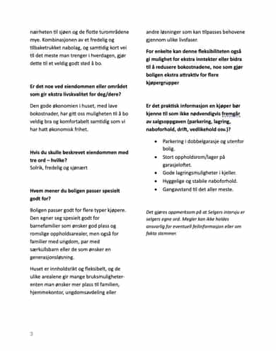 Eiendommen selges etter reglene i avhendingsloven. Generelle bestemmelser: Alle innvendige og utvendige arealangivelser, samt beskrivelser av bygningen er hentet fra vedlagte tilstandsrapport/boligsalgsrapport. Salgsoppgaven er basert på de opplysningene selger har gitt til megler, den bygningssakkyndiges tilstandsrapport, samt opplysninger innhentet fra kommunen, Kartverket og andre tilgjengelige kilder. Det er viktig at kjøper setter seg grundig inn i alle salgsdokumentene, herunder salgsoppgave, tilstandsrapport og selgers egenerklæring. Kjøper anses kjent med forhold som er tydelig beskrevet i salgsdokumentene, og slike forhold kan ikke påberopes som mangler. Dette gjelder uavhengig av om kjøper har lest dokumentene. Det kan være avvik fra dagens rombruk/rombenevnelser sammenlignet med det som er byggemeldt/godkjent. Alle interessenter oppfordres til å undersøke eiendommen nøye, gjerne sammen med fagkyndig før bud inngis. Kjøper som velger å kjøpe usett kan ikke gjøre gjeldende som mangel noe han burde blitt kjent med ved undersøkelsen. Dersom det er behov for avklaringer, anbefaler vi at interessenter rådfører seg med eiendomsmegler eller egne rådgivere før det legges inn bud. En bolig som har blitt brukt i en viss tid, har vanligvis blitt utsatt for slitasje og skader kan ha oppstått. Slik bruksslitasje må kjøper regne med, og det kan avdekkes enkelte forhold etter overtakelse som nødvendiggjør utbedringer. Normal slitasje og skader som nødvendiggjør utbedring, er innenfor hva kjøper må forvente og vil ikke utgjøre en mangel. Kjøper og selgers rettigheter og plikter reguleres av avtalen mellom partene, samt informasjonen som har vært tilgjengelig for kjøperen i forbindelse med handelen. Avtalen utfylles av avhendingsloven, og det gjelder ulike avtalevilkår avhengig av om kjøper er forbrukerkjøper eller ikke. Dette er nærmere beskrevet nedenfor. På grunn av ulike avtalevilkår kan selger vurdere bud fra en som ikke er forbruker, ulikt fra en forbrukers bud. Dersom kjøper ikke er forbruker, er selger sitt mulige mangelsansvar begrenset fordi eiendommen selges "som den er". Selger kan ikke ta «som den er» forbehold ovenfor en forbrukerkjøper. Selv et lavere bud fra en som ikke er forbruker kan foretrekkes fordi begrensningen i mulig mangelsansvar kan ha egenverdi for selger. Selger står fritt til å forkaste eller akseptere ethvert bud, og er for eksempel ikke forpliktet til å akseptere høyeste bud. Budgiver skal i budskjema avgi egenerklæring om budgiver er forbruker eller næringsdrivende/ person som hovedsakelig handler som ledd i næringsvirksomhet. Budgivere får informasjon dersom andre bud er inngitt av en som ikke er forbruker. Forbrukerkjøp - definisjon: Med forbrukerkjøp menes kjøp av eiendom når kjøperen er en fysisk person som ikke hovedsakelig handler som ledd i næringsvirksomhet. Forbruker – avtalevilkår: Eiendommen har en mangel dersom den ikke er i samsvar med kravene som følger av avtalen, eller det foreligger brudd på bestemmelsene i avhendingsloven §§ 3-2 til 3-8. Hvis eiendommen ikke er i samsvar med det kjøperen må kunne forvente ut ifra alder, type og synlig tilstand, kan det være grunnlag for mangelskrav. Det samme gjelder hvis det er holdt tilbake eller gitt uriktige opplysninger om eiendommen. Dette gjelder likevel bare dersom man kan gå ut ifra at det virket inn på avtalen at opplysningen ikke ble gitt eller at feil uriktige opplysninger ikke blir rettet i tide på en tydelig måte. Boligen kan ha en mangel etter avhendingsloven § 3-3 dersom det er avvik mellom opplyst og faktisk innvendig areal, forutsatt at avviket er på 2% eller mer og minimum 1 kvm. Ved beregning av et eventuelt prisavslag eller erstatning må kjøper selv dekke tap/kostnader opptil et beløp på kr 10 000 (egenandel). Ikke-forbruker (næringsdrivende) – definisjon: Hvis kjøper er en juridisk person, eller en fysisk person som hovedsakelig handler som ledd i næringsvirksomhet, vil kjøpet ikke anses som et forbrukerkjøp. Ikke-forbruker – avtalevilkår: Eiendommen har en mangel dersom den ikke er i samsvar med kravene som følger av avtalen. Eiendommen selges «som den er», og selgers ansvar utover det konkret avtalte er da begrenset etter avhendingsloven § 3-9, første ledd andre setning. Avhendingsloven § 3-3 andre ledd fravikes, og hvorvidt boligens arealsvikt utgjør en mangel vurderes etter avhendingsloven § 3-8. Informasjon om kjøpers undersøkelsesplikt, herunder oppfordringen om å undersøke eiendommen nøye, gjelder også for kjøpere som ikke anses som forbrukere. Eiendommen overdras med innredning og utstyr som etter lov, forskrift eller annet offentlig vedtak skal være der, jf. avhendingsloven § 3-4. Varig innredning og utstyr, som enten er fastmontert eller særskilt tilpasset boligen medfølger, med mindre annet er avtalt mellom kjøper og selger, jf. avhendingsloven § 3-5. Tilbehørsliste utarbeidet av Norges Eiendomsmeglerforbund (NEF) er vedlagt salgsoppgaven, og gjelder dersom ikke annet er særskilt avtalt.