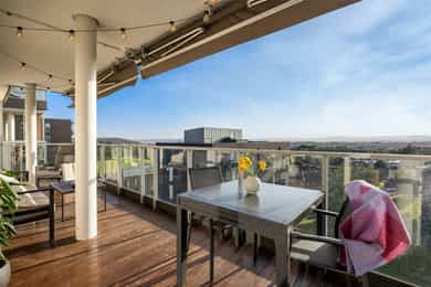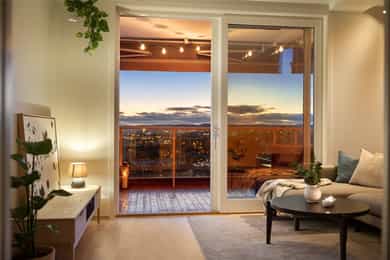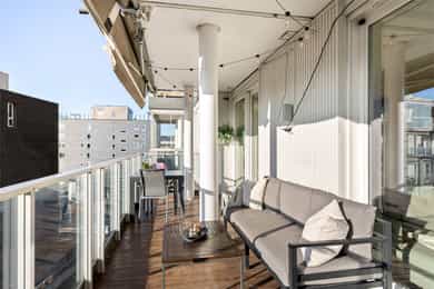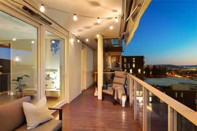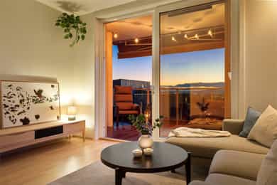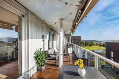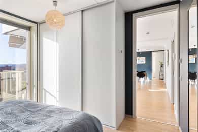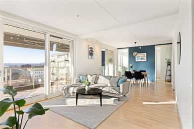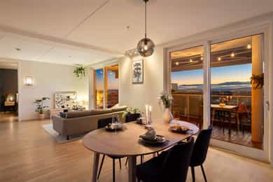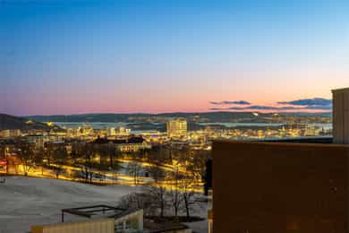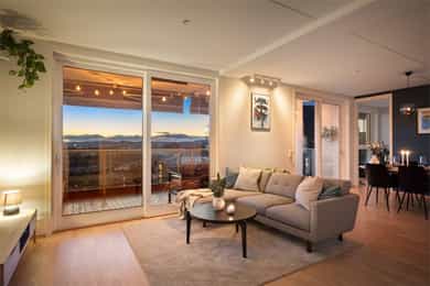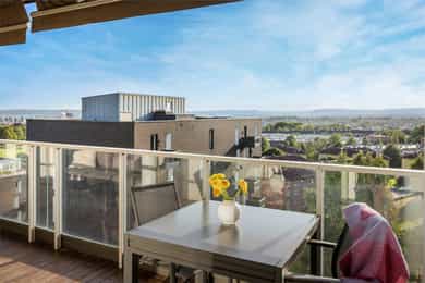 Stilren 3-R i 8.etg m/balkong på 20 m². Gode solforhold og storslått fjordutsikt. Garasjeplass m/el. Vannbåren gulvvarme