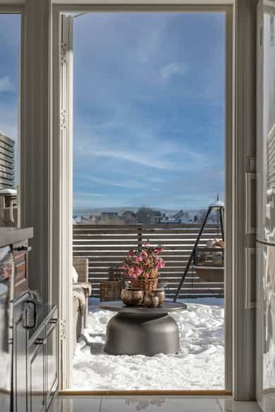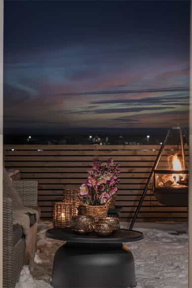 Selger opplyser om at det er soloppgang på terrassen og solnedgang på framsiden av huset.