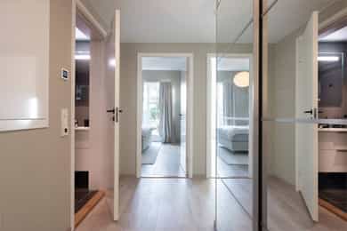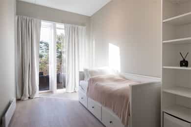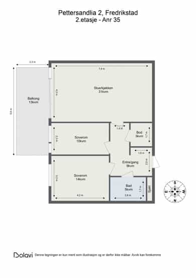 3 km nordvest for Fredrikstad sentrum ligger Pettersand. Området preges av skogkledde koller og etablerte boligområder. Mot vest renner Seutelva, og mot øst går du inn i Fredrikstadmarka. Skoler, barnehager og butikker ligger i grei sykkelavstand. Nabolaget er barnevennlig og lite trafikkert. Pettersand 2 er en av tre blokker på toppen av Haraldåsen — et av områdets beste utsiktspunkter. Blokkene fra 2023 er kledd i malmfuru og omkranses av grønne fellesområder med lekeplasser og benker. Leiligheten har P-plass og bod i kjelleren. Den ligger i 2. etasje med en solrik 13 kvm balkong vendt mot sørvest, der du kan møblere og innta måltider i det fri, med utsikt forbi tretoppene mot Gressvik. Boligens gode standard følger den delikate utformingen. Spesielt takhøyden på hele 2,89 m imponerer.