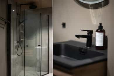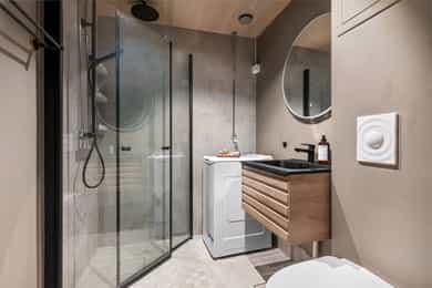 Innvendige overflater: Gulv: 1-stavs laminat på gulv. Vegger: Malte overflate på vegger. Himling: Malt betong i himling. Dører: Innvendige dører er glatte formpressede laminatdører. Kjøkken: Grått Norema-kjøkken fra 2022. Med glatte grålaminerte MDF-fronter og messing håndtak. 20 mm tykk laminatbenkeplate med imitasjon av stein med overlimt sort vaskekum med sortbelagt ettgreps armatur i fra Blanco. Det er integrert kjøl/fryseskap, stekeovn, oppvaskmaskin og platetopp med integrert kullfiltervifte. Det er etablert lekkasjestopper, men ikke komfyrvakt. Avtrekk med kullftiltervifte. Våtrom: 90x90cm flis på gulv og 5x5 mosaikkflis i dusjsonen, og pusset og malt overflate og 90x90cm flis på vegger. Panelplater i himling. Gulvvarme. Badet ble oppgradert i 2022. Badet er utstyrt med opplegg for vaskemaskin, veggmontert wc og dusjhjørne med glassdører og sort belagt ettgreps dusjarmatur i rustfritt stål. 60cm bredt servantskap med profilert laminerte skuffefront med imitasjon av trefinér, sort servant og ettgreps armatur i rustfritt stål. Rommet har naturlig avtrekk og tilluft ved dør. Tekniske installasjoner: - Avløpsrør i plast. Innvendige avløpsrør er skiftet i forbindelse med oppgradering av kjøkken og bad. - Kjøkkenet er flyttet ut i stuen og det er montert en pumpe under vask for å føre vann videre til avløpsanlegget. - Fordelerskap er plassert på bad med stoppekraner for kaldt- og varmtvann som fungerer ved enkel test. - Elektrisk anlegg i leiligheten ble oppgradert i 2022. - Sikringsskap med automatsikringer er plassert i felles gang. Det er fremlagt samsvarserklæring for oppgradering i 2022 og bytte av termostat i 2026. - Vannbåren varme via radiatorer. - Naturlig ventilasjon. Det er i forbindelse med salget utarbeidet en tilstandsrapport fra bygningssakkyndig. Tilstandsrapporten er en teknisk gjennomgang av boligen med oppdagede avvik. Forhold som har fått TG2 og TG3 må gjennomgås spesielt nøye, da disse indikerer avvik fra normal slitasje og/eller høy alder, med mulig behov for utbedring. Bygningsdeler som har fått TGIU er ikke undersøkt av takstmann. Bygningsdeler som har fått TG2: Etasjeskille og gulv på grunn TG-2 settes grunnet planhetsavvik over tolleransekravene i NS 3600. Kjøkken TG-2 grunnet omluftfunksjon/kullfilter. Vannbåren varme TG-2 settes grunnet alder. Våtrom: Bad - Overflater TG-2 settes pga ikke tilfredsstillende høydeforskjell mellom topp slukrist og tettesjikt ved terskel. Våtrom: Bad - Sanitærutstyr TG-2 settes grunnet manglende drensåpning og dokumentasjon på annen godkjent løsning, og fuktmerker i servantskap. Våtrom: Bad - Ventilasjon TG-2 grunnet naturlig ventilasjon. Bygningsdeler som har fått TG3: Ingen. Bygningsdeler som ikke er undersøkt (TGIU): Varmesentral TGIU settes grunnet manglende mulighet for visuell kontroll. Varmtvannsbereder TGIU settes grunnet manglende mulighet for visuell kontroll. Våtrom: Bad TGIU sette grunnet manglende mulighet for hulltaking for tilstrekkelig vurdering av fukt i konstruksjonen. Tilstandsrapport for boligen er vedlagt salgsoppgaven. Se denne for nærmere informasjon om tilstandsgrad.