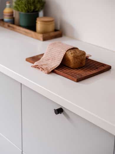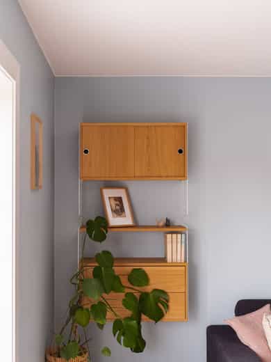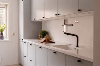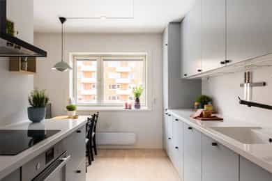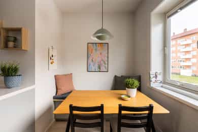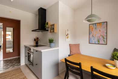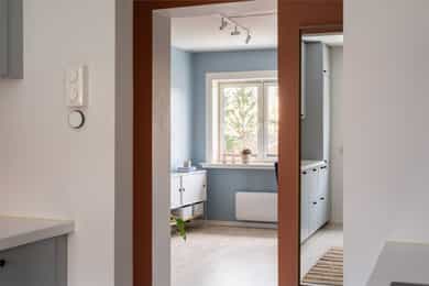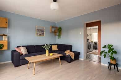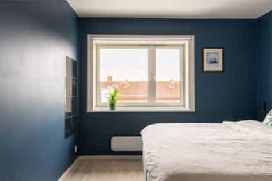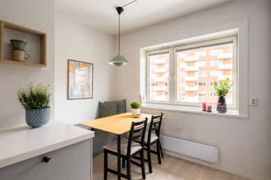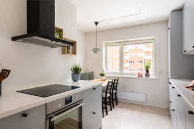 Ditt nye hjem - Rom for rom Entré / gang Leiligheten har en romslig og innbydende entré/gang med god plass til oppbevaring av yttertøy og sko. Her er det montert callinganlegg, og i tilknytning til gangen finnes et praktisk kott som gir ekstra oppbevaringsplass. Gangen leder videre til boligens øvrige rom. I 2026 ble det installert nye downlights i himlingen i entré/gang. Stue Stuen fremstår lys og innbydende med store vindusflater som slipper inn rikelig med naturlig lys. Boligen har god standard på innredninger, overflater og utstyr, og vegg- og takoverflater er holdt i lyse og tidsriktige farger. Rommet har peisovn som gir god varme og et hyggelig samlingspunkt, i tillegg til panelovn for oppvarming. De fleste overflater i boligen, inkludert stue, ble malt i 2020 av tidligere eier. Fra stuen er det utgang til en syd-vestvendt balkong på ca. 3,5 kvm. Balkongen gir et hyggelig uteområde med gode solforhold. Kjøkken Kjøkkenet ble etablert/fornyet i 2018 og har innredning med glatte fronter. Innredningen består av både over- og underskap med belysning under overskap. Veggen mellom benkeplate og overskap er malt. Benkeplaten er i laminat med nedfelt oppvaskkum og ettgreps svingbart blandebatteri. Kjøkkenet er utstyrt med integrerte hvitevarer som induksjonstopp, stekeovn, oppvaskmaskin, kjøleskap og fryser. Det er montert komfyrvakt. Det anbefales å montere aquastopp. Soverom Boligen har to soverom. Hovedsoverommet har skyvedørsgarderobe som gir gode oppbevaringsmuligheter, samt panelovn. Det andre soverommet har innebygd garderobeskap og egner seg godt som barnerom, gjesterom eller hjemmekontor. Overflatene i rommene ble malt i 2020 av tidligere eier. Bad / vaskerom Flislagt bad/vaskerom innredet med servantskap med nedfelt servant (det opplyses om en liten sprekk i vasken), veggskap med speildører og belysning over. Det opplyses at lyset over speildørene per i dag ikke fungerer, og at dette ikke vil bli utbedret før overtakelse. Videre er rommet utstyrt med vegghengt toalett med innebygd sisterne, dusjsone med innfelte dusjdører i herdet glass og benkeplate i Corian. Det er opplegg for vaskemaskin. Gulvet har varmekabler og himlingen er nedsenket med downlights. I 2024 ble det installert ny termostat til gulvvarmen. I 2022 ble dusjarmatur samt blandebatteri til servant skiftet. Innvendige overflater Gulv: Parkett i stue, kjøkken og soverom. Fliser med varmekabler i entré/gang og på bad/vaskerom. Vegger: Hovedsakelig malte flater. Flislagte vegger på bad/vaskerom. Malt vegg mellom benkeplate og overskap på kjøkken. Himling: Malt betonghimling i stue, kjøkken og soverom. Malt gipshimling i entré/gang og på bad/vaskerom. Downlights i entré/gang og på bad/vaskerom. Boder Leiligheten disponerer tre boder. Dette inkluderer en loftsbod på ca. 5 kvm, en kjellerbod på ca. 10 kvm samt en mindre kjellerbod på ca. 2 kvm. Den største kjellerboden er utstyrt med hyllesystem som gir gode oppbevaringsmuligheter, mens den minste boden egner seg godt til oppbevaring av blant annet ski eller annet sportsutstyr.