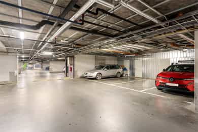 Med leiligheten hører 1 stk. garasjeplass som er samlokalisert med kjellerbod bak garasjeplassen, forberedt for elbil-lading. Billig utendørs gjesteparkering (Easypark), gratis i helg utenom åpningstider for barnehagen.