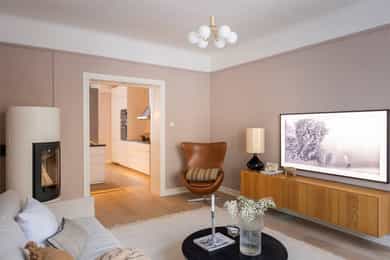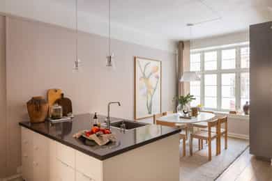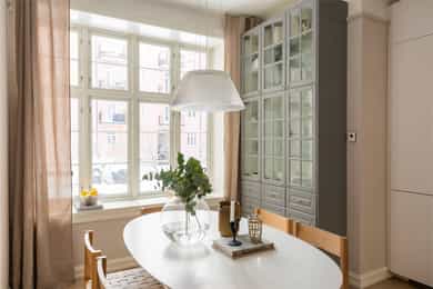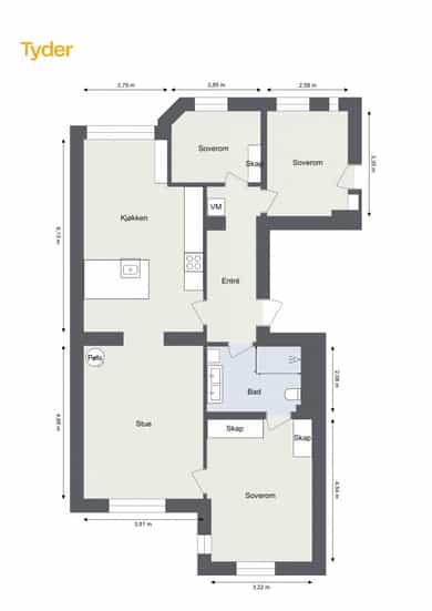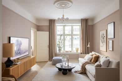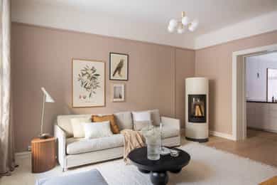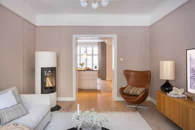 Høy 1.etasje, 89 kvm BRA-I: Bad, Entré, Stue, Kjøkken, Tre soverom. Leiligheten disponerer tre eksterne boder, hvorav to eksterne boder i kjeller på totalt 11 kvm og én loftsbod på ca. 5 kvm (7 kvm gulvareal). Entré Velkommen inn! I leiligheten blir du møtt av en innbydende entré med god plass til garderobeløsninger eller knaggrekke. Pene overflater bestående av flislagt gulv med varmekabler, vegger malt i tidsriktig farge og lysmalt himling med belysning. Stue Lys og luftig stue med store vindusflater og generøs takhøyde på ca. 2,90 meter. Her har man også klassiske elementer som rosett i himlingen. Det er god plass til sofagruppe og tv med tilhørende møblement. I hjørnet av stuen er en flott peisovn med glassdør. Pipen ble rehabilitert med innvendig stålrør i 2015/2016. Det er behagelig gulvvarme i hele leiligheten. Stort spisekjøkken Leilighetens kjøkken ligger delvis adskilt fra stuen. Lys og stilren IKEA-kjøkkeninnredning fra 2013/14 bestående av glatte fronter fra 2025 og benkeplate i steinkompositt med nedfelt kum i rustfritt stål, samt sosial kjøkkenøy i tilsvarende utførelse. Kjøkkenet er utstyrt med integrerte hvitevarer som induksjonstopp, stekeovn, oppvaskmaskin, mikrobølgeovn og kjøle- og fryseskap. Komfyrvakt er montert. Bad Delikat, flislagt bad fra 2013/14 bestående av flislagt gulv med varmekabler, flislagte vegger og malt himling med downlights. Badet er utstyrt med baderomsinnredning bestående av benkeskap og veggskap med glatte fronter og speil over servant. Badet er utstyrt med dusj med faste felt og dør i herdet glass, dobbel servant i helstøpt plate samt veggfestet klosett med innebygget sisterne. Hovedsoverom Romslig hovedsoverom med god plass til dobbeltseng og nattbord. Lagringsplassen er ivaretatt i store garderobeskap. Soverom 2 og 3 Soverom 2 og 3 er av god størrelse og egner seg begge som barnerom, gjesterom eller kontor.