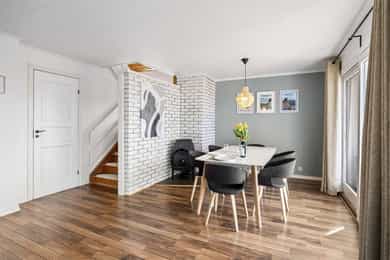 Innholdsrik enebolig innerst i blindvei. Barnevennlig beliggenhet. Pent opparbeidet hage og gode solforhold. Garasje.