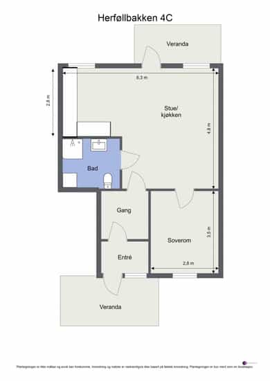 BRA-i: 48 kvm. Vindfang, entré/gang, stue/kjøkken, bad og soverom.