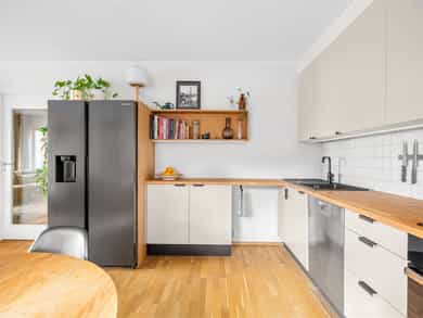 Kjøleskap og integrerte hvitevarer på kjøkken medfølger.