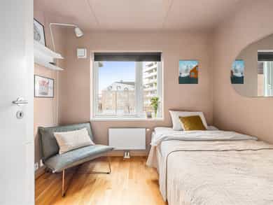 - Gardiner på skinne på stue og soverom.