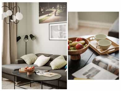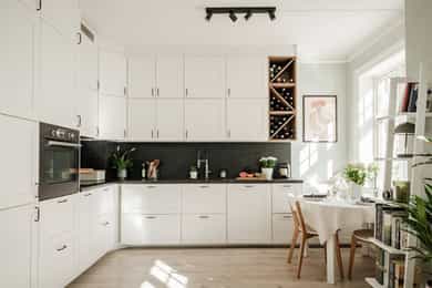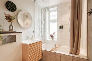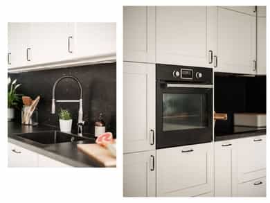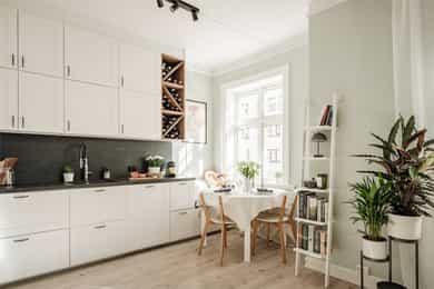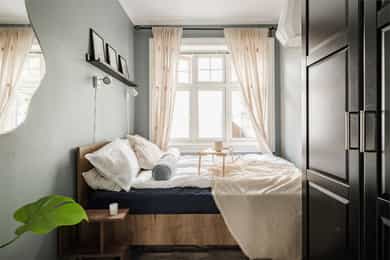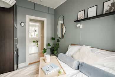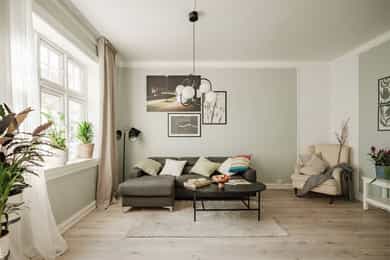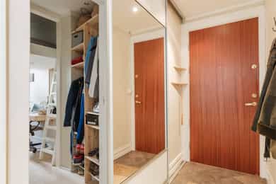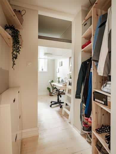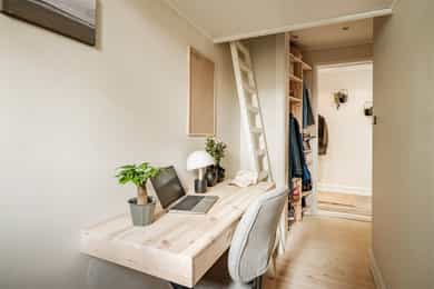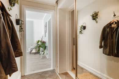 ENTRÉ Lys og innbydende entré med plass til oppheng av yttertøy. Praktiske skyvedører leder videre til en mellomgang med rikelig garderobeplass. STUE/KJØKKEN Lys og romslig stue med store vindusflater som slipper inn godt med dagslys. Her er det god plass til både sofagruppe og spisebord. Gulvet ble lagt nytt i 2021 med varmefolie for ekstra komfort. Kjøkkenet ble pusset opp i 2021 og har moderne, glatte fronter, laminert benkeplate med overliggende oppvaskkum og ettgreps blandebatteri. Veggene over benken er kledd med laminatplater. Kjøkkenet er utstyrt med integrerte hvitevarer: kjøl/frys, oppvaskmaskin, platetopp og stekeovn. Over stekesonen er det montert kullfiltervifte. I tillegg er det en praktisk sittebenk ved vinduet med plass til spisebord – perfekt for hyggelige måltider. SOVEROM OG KONTOR Romslig soverom med plass til dobbeltseng og garderobeskap. Vindu mot rolig bakgård gir en skjermet og fredelig atmosfære. I mellomgangen mellom stue og soverom er det en praktisk, innebygd hylleløsning. Fra entréen har man også adkomst til et kontor/disponibelt rom med plass til skrivebord og oppbevaring. Rommet har i tillegg en praktisk hems for ekstra lagringsplass. BAD Pent og funksjonelt bad med badekar, veggmontert toalett og servantskap med ettgreps blandebatteri fra Grohe. Det er opplegg for vaskemaskin i en egen nisje med benkeplass og overskap. Mekanisk avtrekk og stoppekran er installert. Badet ble i 2023 oppgradert med sparklede og malte vegger, kalkmaling på vegg mot soverommet, ny baderomsinnredning, malt skyvedører, satt inn skapdører i hyllene ved toalettet og byttet spotter.