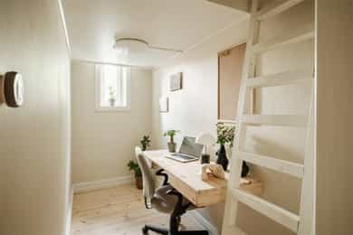 - Oppgradert kontor: Slipt og oljet gulv, plassbygget hyller og pult, sparklet og malt vegger.