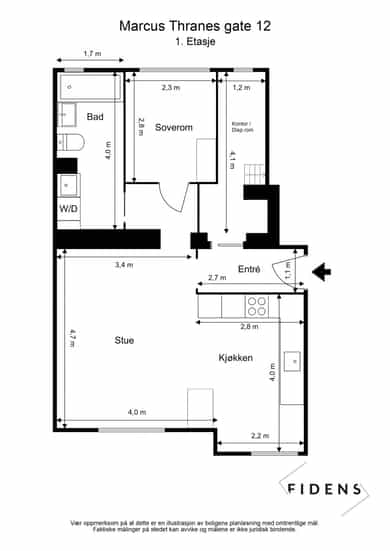 BRA-i: 53 kvm. Entré, stue, kjøkken, bad, soverom og kontor.
