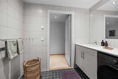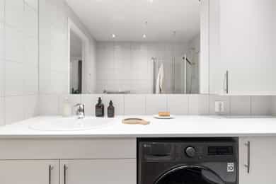 Vaskemaskin på hovedbadet medfølger (ikke hybel) maskinen er kombinert vask- og tørketrommel og leveres uten garanti forutenom evt gjenstående leverandørgaranti.