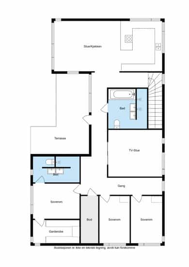 1. Etasje: Gang, bod, tv-stue, stue, kjøkken, 3 soverom, 2 bad og garderobe. U. Etasje: Hall, gang, bod/teknisk rom, vaskerom, sluse/bod og garasje. Terrasse på hele 83 m2 med adkomst fra 1. etasje. Stor integrert garasje med innvendig adkomst fra boligen. Garasjen er bygget med lydhimling som reduserer lyd og viberasjoner opp til soveromsdelen av huset.