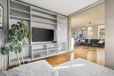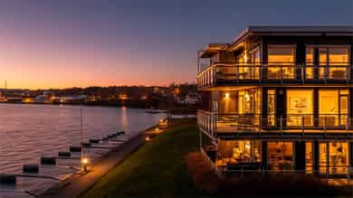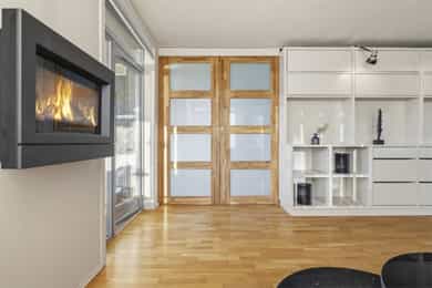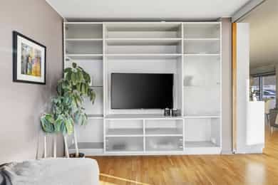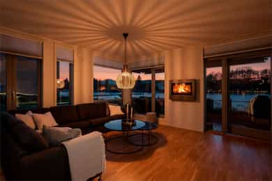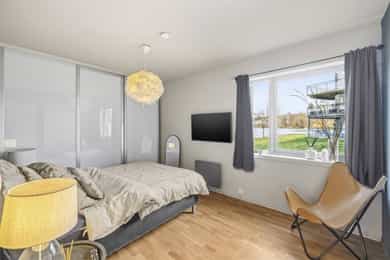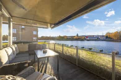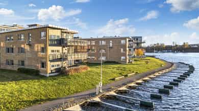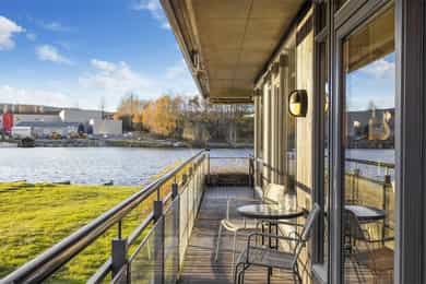 Innbydende brl-leilighet med fantastisk beliggenhet på ytterste rekke mot elven. 3 (4) sov. 2 bad. Garasje. IN-ordning.