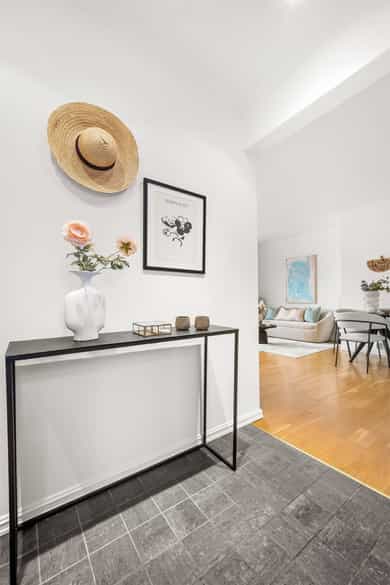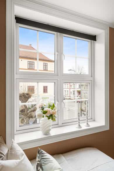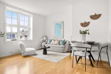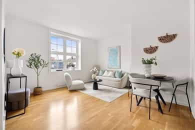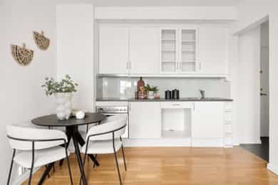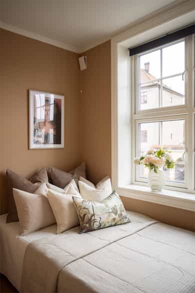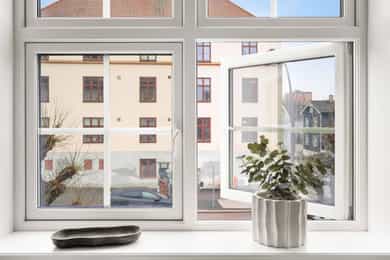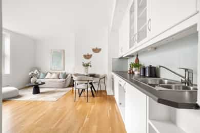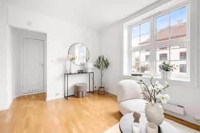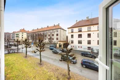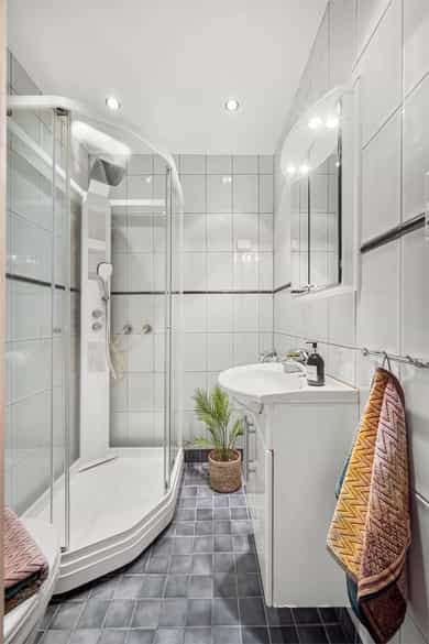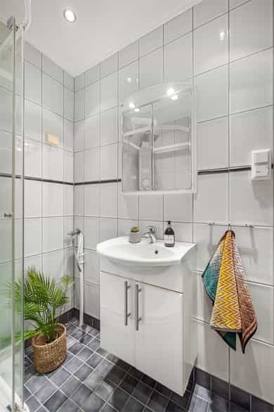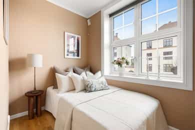 Entré: Velkommen inn! Praktisk gang som gir et godt førsteinntrykk. Fra gangen er det direkte adkomst til den innvendige boden. Her er det godt med ekstra lagringsplass. Gangen har flislagt gulv med varme. Åpen kjøkken- og stueløsning: Pent, praktisk kjøkken med god utnyttelse av plassen. Lys innredning med hvite, glatte fronter og benkeplate i laminat. Kjøkkenet har integrert platetopp, stekeovn og kjøleskap, samt kullfilterventilator over kokeplass. Det ble montert ny belysning på kjøkkenet i 2026. Oppholdsrommet er hyggelig og av god størrelse. I stuen er det god plass til sofa med tilhørende stuemøblement og spisebord ved kjøkkenet. Takhøyden er oppmålt til 2,64 meter og stort vindu gir godt innslipp av naturlig lys. Åpent og fint utsyn mot gate. Dette bidrar til en luftig og god romfølelse. De dype, tidstypiske vinduspostene er perfekte for planter og dekor. Overflatene består av trestavs parkett og veggene er malt i lys farge. Vegger og tak er malt i Lady Pure Colour og Lady Supreme Finish 40 glans. Soverom: Leiligheten har et lunt og innbydende soverom. Det er god plass til dobbelseng og nattbord. Soverommet har stort vindu som sikrer godt med lys og luft. Rommet er malt i en tidsriktig og behagelig fargetone. Bad: Flott, tidløst bad med flislagte overflater, elektrisk gulvvarme og innfelte downlights i himling. Badet har vegghengt toalett, dusjkabinett, baderomsinnredning med nedfelt servant, samt speilskap med belysning. Opplegg for vaskemaskin. Det ble installert «flow stop» og nytt dusjkabinett i 2017. Overflater: Gulv: Trestavs parkett og fliser med elektrisk gulvvarme i gang og på badet. Vegger: Malte vegger og fliser på badet. Himling: Himlinger med malte plater. Takhøyden i stuen ble målt til 2,64 meter.