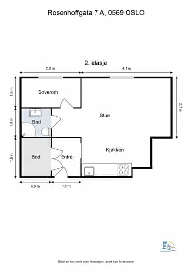 Leiligheten ligger i 2. etasje og inneholder entré, kjøkken, stue, bad og soverom. I tillegg disponerer leiligheten to boder. En loftsbod med gulvareal på ca. 5 kvm. og en kjellerbod på ca. 9,9 kvm.