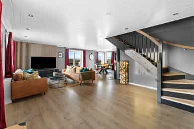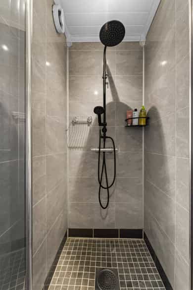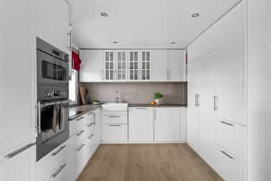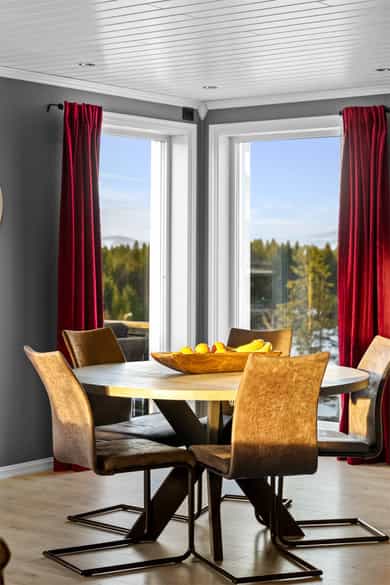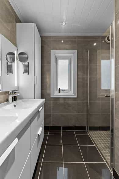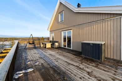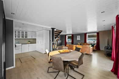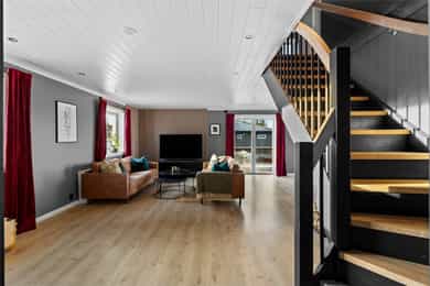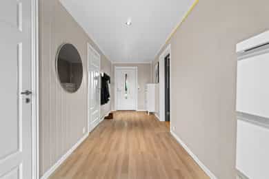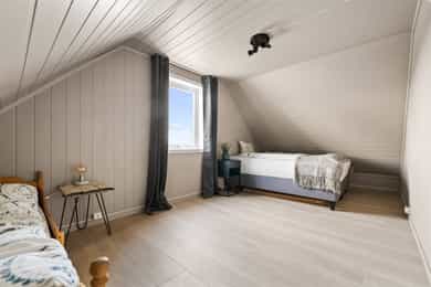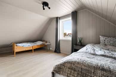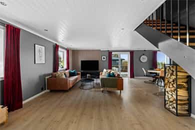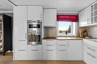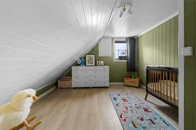 Entre Romslig entre med varme i gulv og god plass til ønsket garderobeløsning. Stue Stuen er et lyst og luftig oppholdsrom med gjennomgående lys fra store vindusflater, downlights i himling og tofløet balkongdør til stor terrasse. Tidsriktige overflater med glatte vegger, laminat gulv og kontrastvegg med spiler. Delvis åpen løsning med kjøkkenet som gir naturlig plassering av spisestue. Fantastisk utsikt fra hjørnevinduer som tilnærmet strekker seg fra gulv til tak. Kjøkken Tidløst kjøkken med hvite, profilerte fronter, benkeplate i laminat og integrerte hvitevarer. Det er rikelig med skap- og benkplass. Åpen løsning mot spisestuen. Bad Helfliset bad i naturtoner fra 2019. Innredning i form av skuffeseksjon under dobbel servant, høyskap og speil med integrert belysning. Det er også varme i gulv, vegghengt toalett, romslig dusjsone med regnfallsdusj og nisje for vask/tørk. Downlights i himling. Soverom Boligen har tre soverom av fin størrelse. Hovedsoverom i første etasje med stor garderobeløsning. I andre etasje har man et typisk barnerom og et stort og allsidig soverom som innredes etter egne behov. Teknisk Rør i rør fra 2019 til bad og kjøkken Fordelerskap bak veggplater på soverom. Avløpsrør i plast innvendig nytt i 2019. Varmtvannsbereder på 200 liter plassert i kjeller. Sikringsskap med automatsikringer. Skjult og åpent el anlegg. El anlegg oppgradert siden 2019. Brannslukningsapparat. Røykvarslere. Tilstandsrapport Det er i forbindelse med salget utarbeidet en tilstandsrapport fra bygningssakkyndig. Tilstandsrapporten er en teknisk gjennomgang av boligen med oppdagede avvik. Forhold som har fått TG2 og TG3 må gjennomgås spesielt nøye, da disse indikerer avvik fra normal slitasje og/eller høy alder, med mulig behov for utbedring. Bygningsdeler som har fått TG2: Taktekking: Taktekking fra 1982. Mer enn halvgått levetid på tak/undertak. Noe mose og slitasje. Nedløp/beslag: Ikke tilfredsstillende bortledning av vann, mangler snøfangere, mangler takstige for feier. Veggkonstruksjon: Enkelte ufagmessige løsninger. Liten lufting i nedkant av kledning. Takkonstruksjon: Større avstand mellom taksperrer enn hva som er normal byggeskikk i dag. Selger opplyser at takkonstruksjon er forsterket med 2*8 til mønet. Vinduer: Avvik i innsettingsdetaljer. Terrasse: Noe skjevhet på rekkverk. Overflater: Noe skjevheter i 2. etasje. Etasjeskille: Deler av etasjeskiller av eldre dato. Ingen unormale skjevheter registrert. Radon: Ikke utført radonmåling. Rom under terreng: Det må påregnes fuktvandring i eldre kjellere. Virker ikke fuktig under befaring. Krypkjeller: Det er påvist noe provisoriske understøttelser av etasjeskiller. Ventilasjon: Det er ikke veggventiler i alle rom. VV.tank: Halvgått forventet levetid. Drenering: Mer enn halvparten av forventet levetid på drenering er overskredet. Grunnmur/fundamenter: Noe avskalling utvendig på grunnmur. Utvendig vann/avløp: Vurdering er basert på alder. Mer enn halvgått forventet levetid. Bad: Krav til fall (høydeforskjell) er ikke oppfylt, men det er fall til sluk. Bad: Det er ikke fremvist dokumentasjon på utførelse og materialer for våtrommets tettesjikt. Bad: Løsgummipakning i bunn på dusjdør. Ikke luftespalte under dør. Bygningsdeler som har fått TG3: Innvendig trapper: Repo i 2. etasje mangler rekkverk. Terrengforhold: Det er fall mot grunnmur fra gårdsplass.