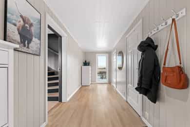Nordvik Eiendomsmegling presenterer Østvollvegen 285 - Enebolig på landlig tomt med nydelige sol- og utsiktsforhold. Boligen er vesentlig påkostet i perioden 2018 - 2025 med bla. etterisolering, vinduer, kledning, alle overflater, bad, kjøkken og el-anlegg. Boligen har en god plansløsning med stor gang, stue/kjøkken i sosial sone, hovedsoverom og bad/vaskerom i første etasje. Andre etasje med to gode soverom og gang. Høydepunkter