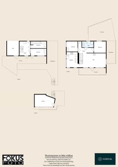 Underetasje: Gang, soverom og vaskerom 1. etasje: Gang, stue, kjøkken, bad og 2 soverom