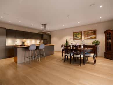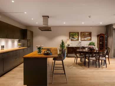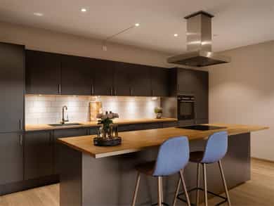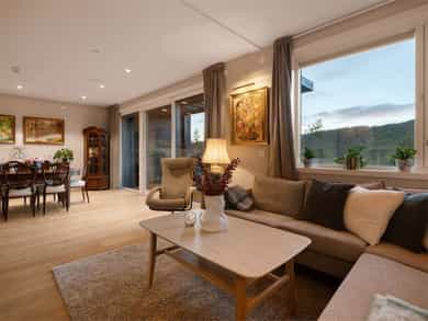 Ditt nye hjem - Rom for rom Entré Velkommen inn i en lys og innbydende entré med flislagt gulv med behagelig gulvvarme, som gir en lun og komfortabel velkomst. Veggene er malt i en nøytral fargetone og himlingen er malt og utstyrt med downlights som gir god belysning. I tillegg finnes en romslig skyvedørsgarderobe med god plass til oppbevaring av yttertøy og sko. Stue / Spisestue Stue og spisestue ligger i en åpen og gjennomgående løsning med naturlig plassering av sonene. Den romslige stuen byr på god plass til sittegruppe og har store skyvedører i glass med utgang til en vestvendt balkong på ca. 14 kvm. Et trivelig uterom med takoverbygg og koselig utsikt. Spisestuen er plassert i forlengelse av stuen med god plass til langbord og mulighet for hyggelige middager og sosiale lag. Overflatene består av eikeparkett på gulv, malte vegger og malt himling. Det er vannbåren gulvvarme i hele oppholdsarealet som sikrer jevn og behagelig temperatur. Spisestuen var tidligere et soverom, og kan tilbakeføres om det er ønskelig med et ekstra soverom. Kjøkken Stilrent og funksjonelt kjøkken fra Sigdal med gjennomgående moderne materialvalg og god skapplass. Innredningen består av høyskap, over- og underskap med glatte fronter, samt belysning under overskapene. Mellom benkeplate og overskap er det flislagt med lyse, avlange fliser i moderne utførelse. Benkeplaten er i heltre, med nedfelt oppvaskkum i rustfritt stål og ettgreps svingbart blandebatteri i krom. Kjøkkenet er utstyrt med integrerte hvitevarer som induksjonsplatetopp, stekeovn, oppvaskmaskin og kjøleskap. Kjøkkenøyen gir ekstra arbeidsflate og sitteplasser, og er et naturlig samlingspunkt i rommet. Det er montert komfyrvakt og aquastopp. Overflatene består av eikeparkett på gulv, malte vegger og malt himling med downlights. Vannbåren gulvvarme gir en jevn og behagelig temperatur. Soverom Leiligheten har to soverom, begge med gode lysforhold og utsyn mot grønne omgivelser. Hovedsoverommet er romslig og har skyvedør ut til en fransk balkong, som gir en luftig og åpen følelse. Det er innredet med stor skyvedørsgarderobe som gir god oppbevaringsplass. Det andre soveromme har garderobeskap samt store vindusflater som slipper inn rikelig med dagslys. Begge rommene har eikeparkett på gulv, malte vegger og malt himling. Bad / Vaskerom Leiligheten har to stilrene og moderne baderom, begge med fliser på gulv og vegger, malt himling med downlights. Hovedbadet fungerer også som vaskerom og er innredet med frittstående boblebadekar, vegghengt toalett med innebygd sisterne og servantskap med nedfelt servant og speil med lys. Det er en egen vaskesone med opplegg for vaskemaskin og tørketrommel i søyle. Det andre badet er utstyrt med dusjhjørne med innfellbare dusjdører i herdet glass, samt tilsvarende innredning med vegghengt toalett og servantskap. Begge rommene har elektriske varmekabler i gulvet. Teknisk rom/bod Leiligheten har et eget teknisk rom/bod på ca. 3 kvm med eikeparkett på gulv, malte vegger og malt himling. Rommet inneholder sikringsskap, aggregat til balansert ventilasjon, vannfordelerskap med vannmåler og stoppekran, samt fordeler for vannbåren gulvvarme. I tillegg medfølger en romslig ekstern bod på ca. 8 kvm, plassert i felles gang og merket med nr. 5. Dette gir godt med lagringsplass utenfor selve boenheten.