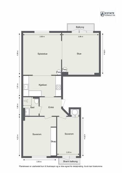 BRA-i: 82 kvm. Kjøkken, stue, spisestue, bad, entré og to soverom.