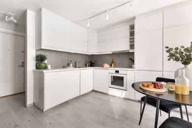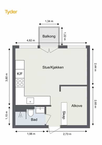 Entré: Leiligheten har en praktisk entré med plass til yttertøy og sko. Her er det garderobeløsning som gir gode oppbevaringsmuligheter og en ryddig overgang inn til resten av boligen. Stue/kjøkken: Stue og kjøkken ligger i åpen løsning, noe som gir en god romfølelse. Det er plass til både sofagruppe og spisebord. Store vindusflater slipper inn godt med lys, og fra stuen er det utgang til balkong. Kjøkken: Kjøkkenet har en funksjonell utforming med god skap- og benkeplass. Innredningen har glatte fronter og flis på vegg over benk. Laminat benkeplate med nedfelt kum. Integrerte hvitevarer følger med. Bad: Lekkert totaloppusset bad fra 2024. Baderommet inneholder dusj med skillevegg i herdet glass, servant i helstøpt plate og veggfestet klosett med innebygget sisterne. Alkove: Leiligheten har en alkove som fungerer godt som soveplass. Løsningen gir en naturlig inndeling mellom oppholdsrom og sone for seng. Balkong: Balkong med adkomst fra stuen. Her er det mulighet for å etablere en hyggelig sitteplass.